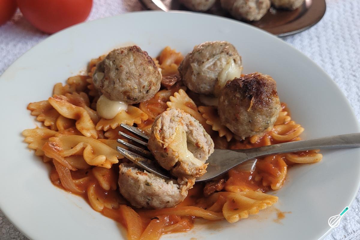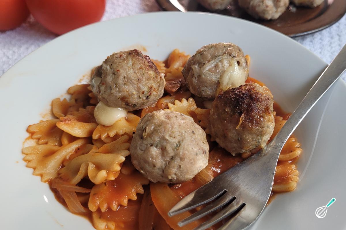 Essas almôndegas de linguiça ficam ótimas para servir com arroz, salada, mas aqui optei por fazer com um macarrão, que você pode cozinhar rapidinho enquanto as almôndegas estão na airfryer e servir com molho de tomate para uma refeição prática e rápida!