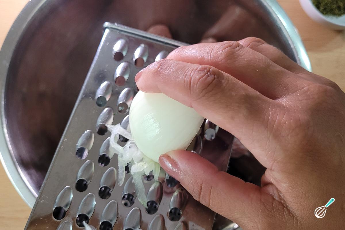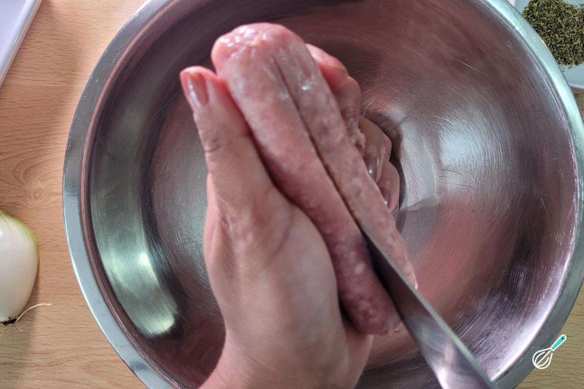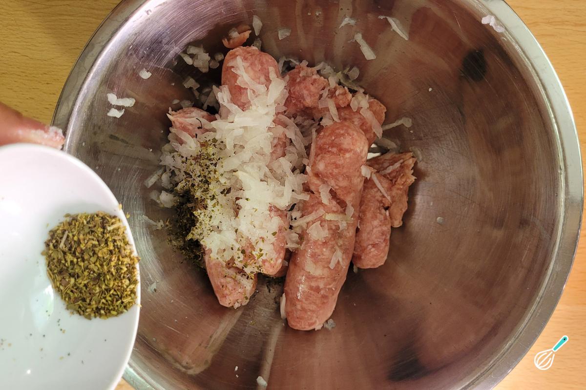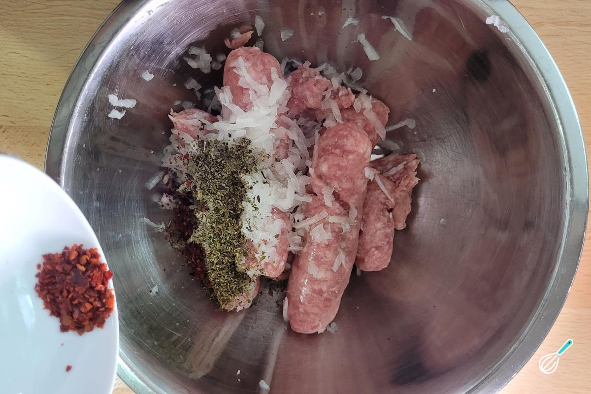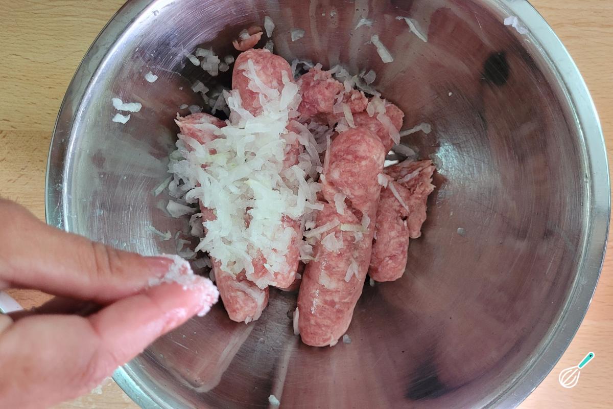 Coloque as linguiças sem a pele em uma tigela grande e adicione a cebola ralada. Também pode colocar a cebola bem picadinha, mas ralando ela não só mistura mais fácil, como solta água que ajuda as almôndegas a ficarem mais suculentas.