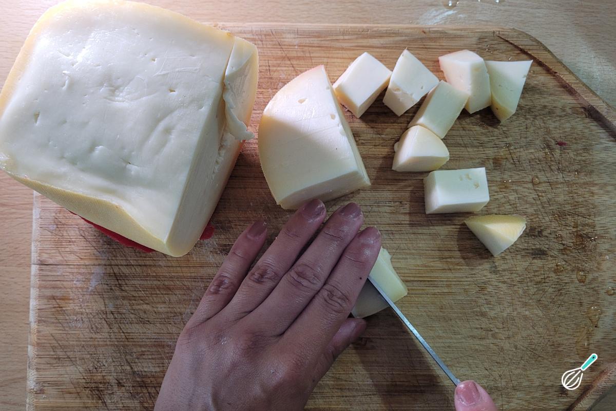 Corte o queijo em cubinhos pequenos de acordo com o tamanho que for fazer as almôndegas, de forma que consiga rechear e fechar as almôndegas