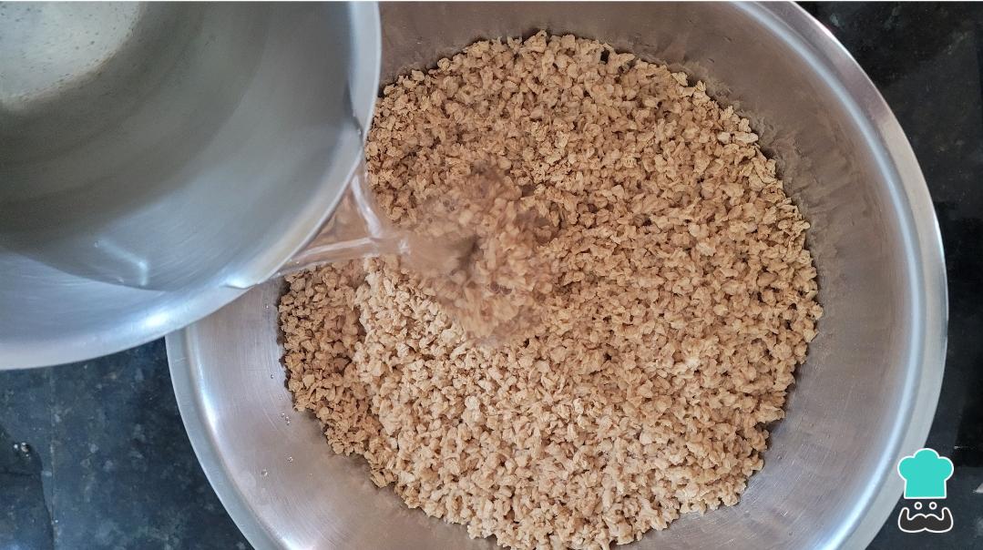 Comece colocando a proteína de soja de molho, junto com a água e o vinagre. Deixe por 30 minutos.