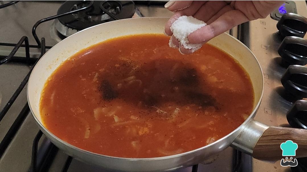Com a cebola quase transparente, acrescente o molho de tomate, a água, o sal e a pimenta-do-reino. Misture bem e deixe ferver por 3 minutos.