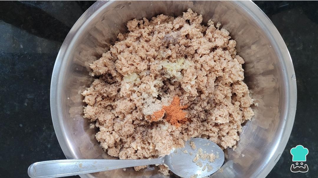 Coloque em um recipiente e adicione o alho amassado, a páprica, a pimenta-do-reino, o sal e o cominho. Misture bem.