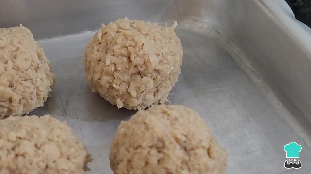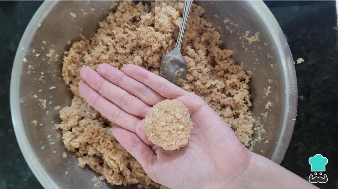 Molhe as mãos com água e pegue porções da mistura com uma colher. Aperte e molde bolinhas.
