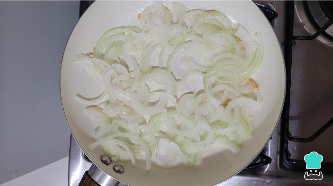Para o molho, coloque o óleo e o alho em uma panela. Quando o alho estiver dourado, adicione a cebola.