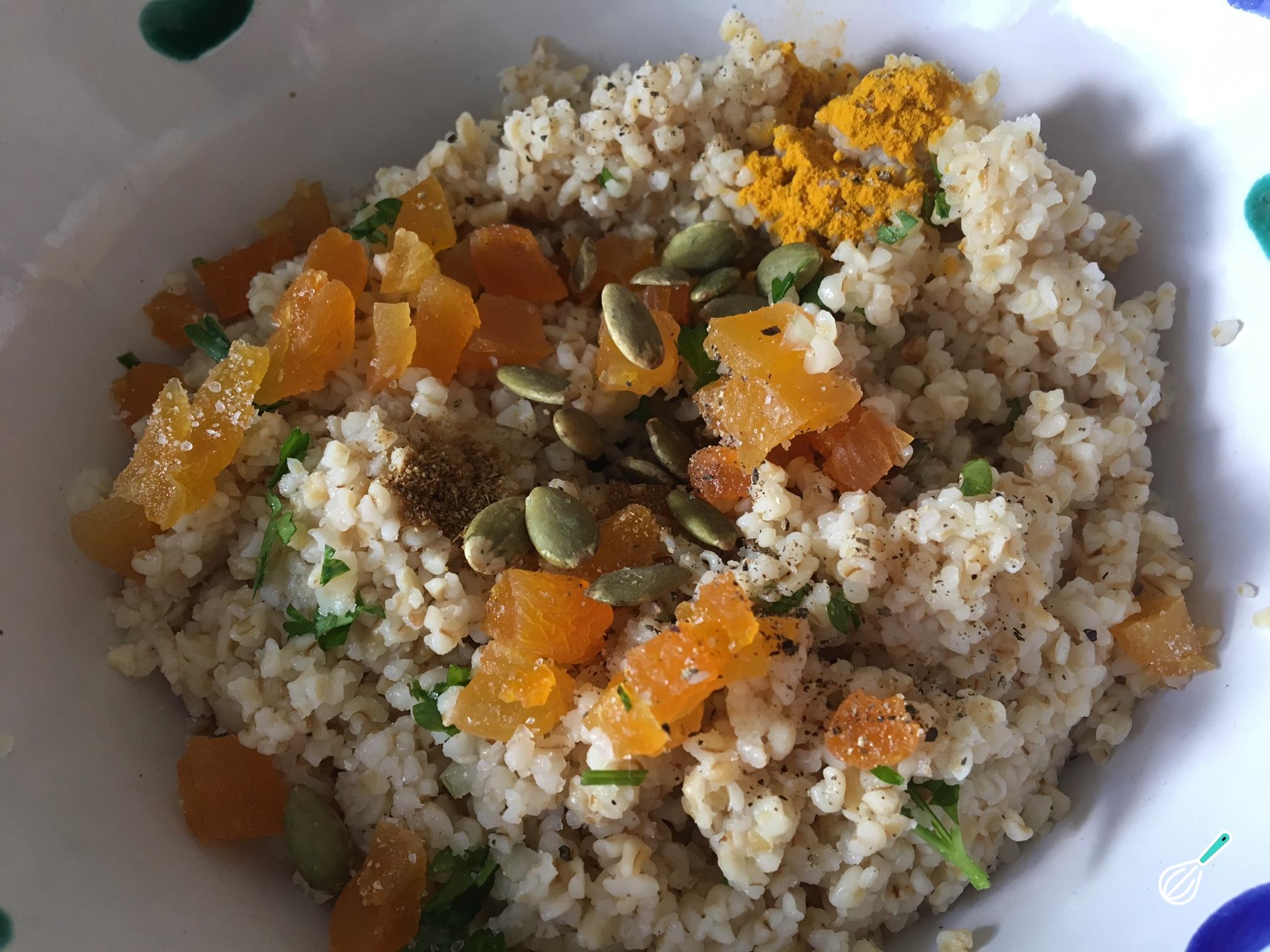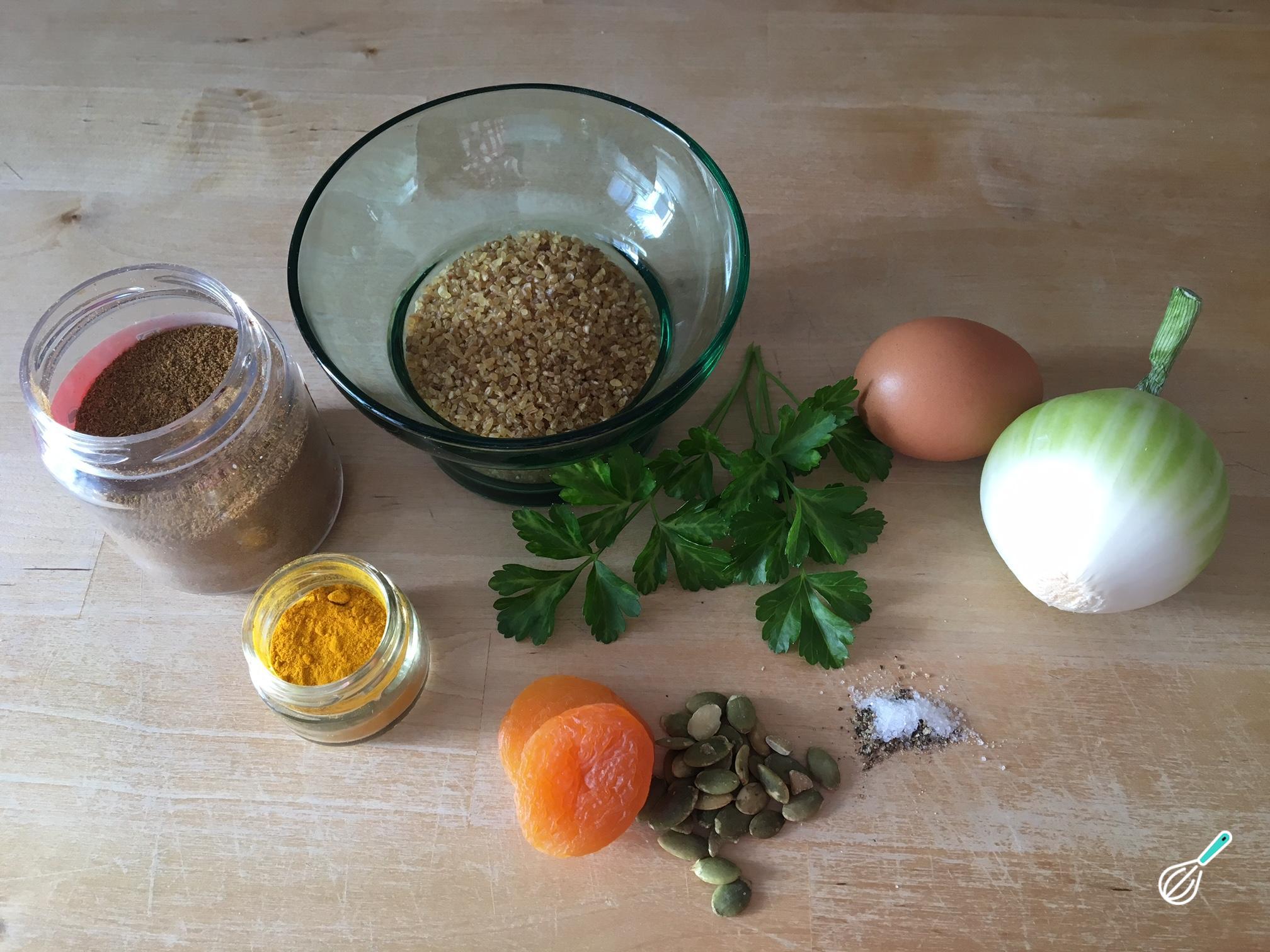 Em seguida adicione os damascos secos picados, as sementes de abóbora e as especiarias (cominho e açafrão). Adicione sal e pimenta a gosto, o ovo batido e misture tudo muito bem.