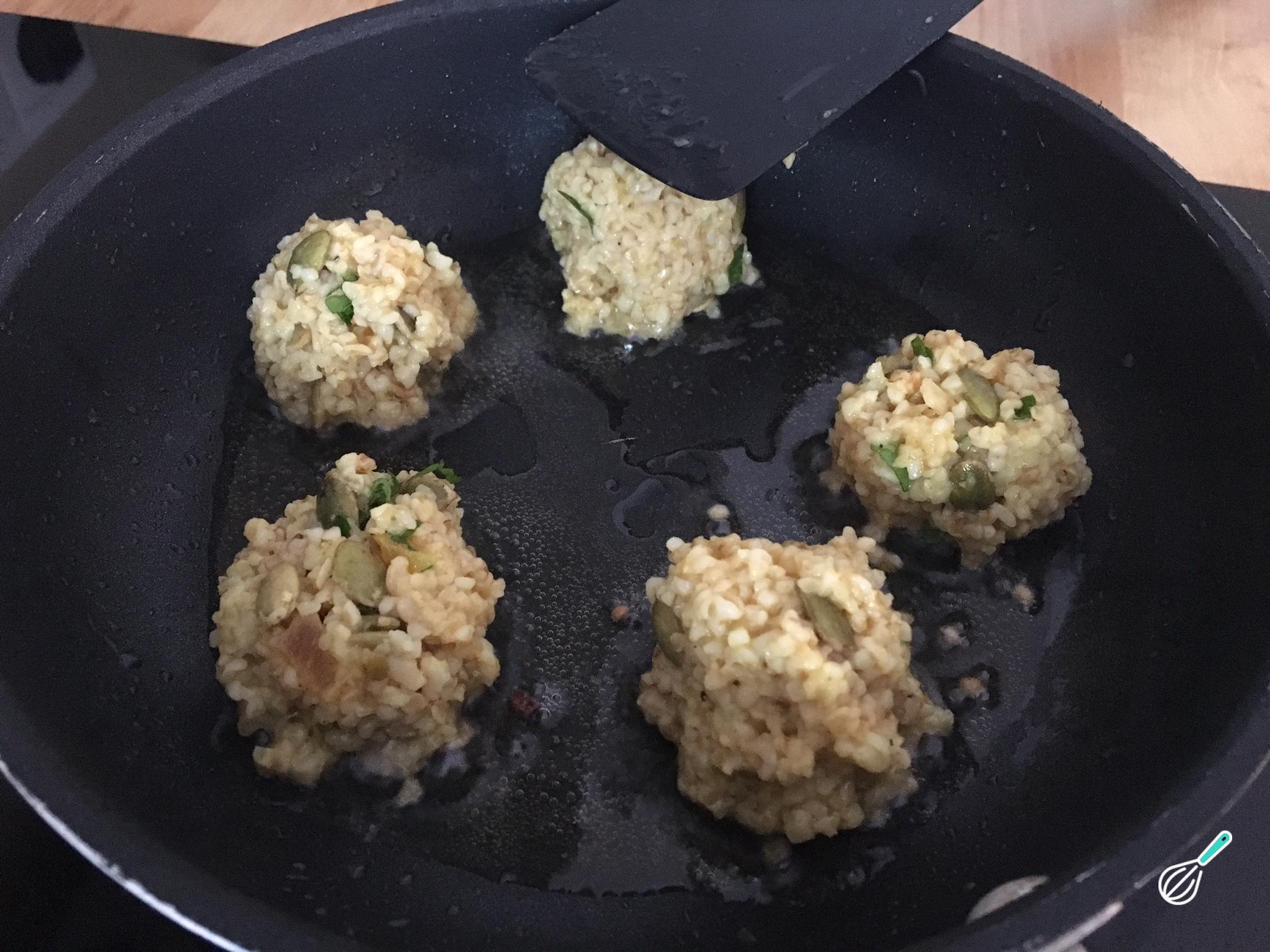 Depois do tempo indicado é hora de cozinhar as almôndegas de triguilho! Numa frigideira esquente um pouco de azeite de oliva e doure as almôndegas de todos os lados.