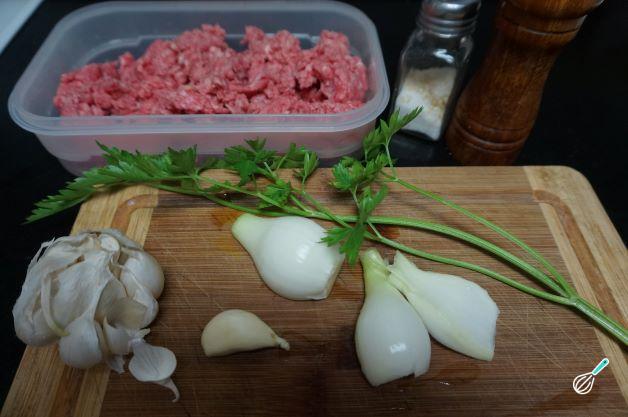 Junte a carne numa tigela com a cebola picada, os dentes de alho, a salsinha e o ovo, misture tudo muito bem. Coloque um pouco de sal e pimenta, misture novamente muito bem. Deixe a carne descansar por cerca de 15 minutos para que a carne pegue o gosto dos temperos.
