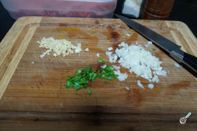 Corte a cebola e os dois dentes de alho em pedaços bem pequenos. Lave a salsinha e pique bem.
