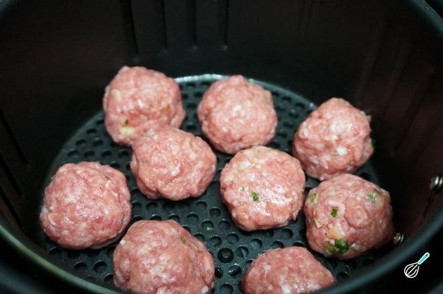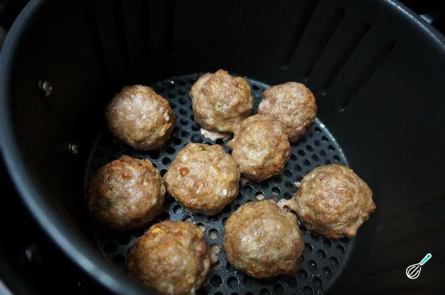 Abra a air fryer na metade do tempo para verificar as almôndegas. Vire e coloque a fritadeira novamente para o resto do tempo terminar de cozinhar.