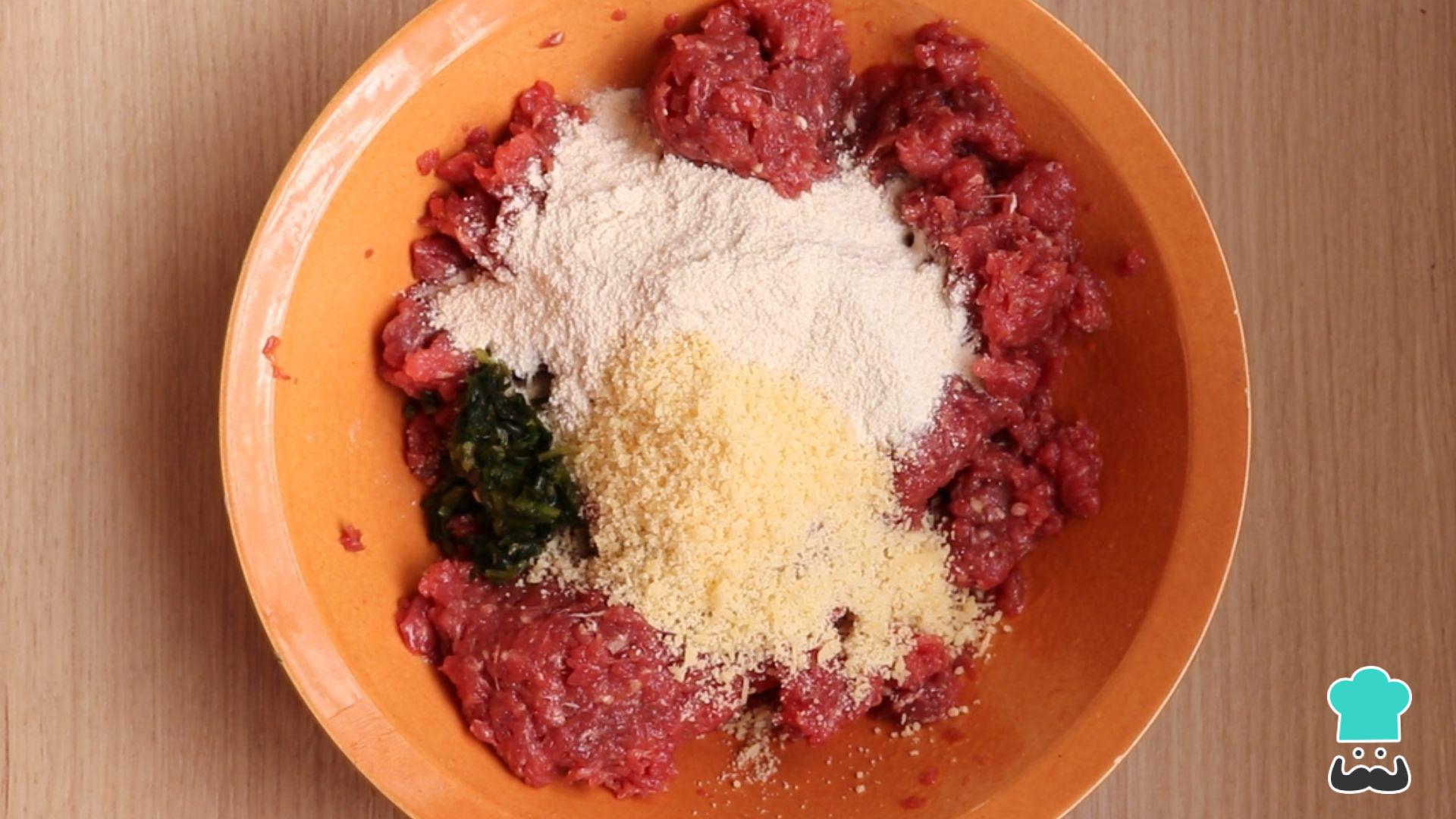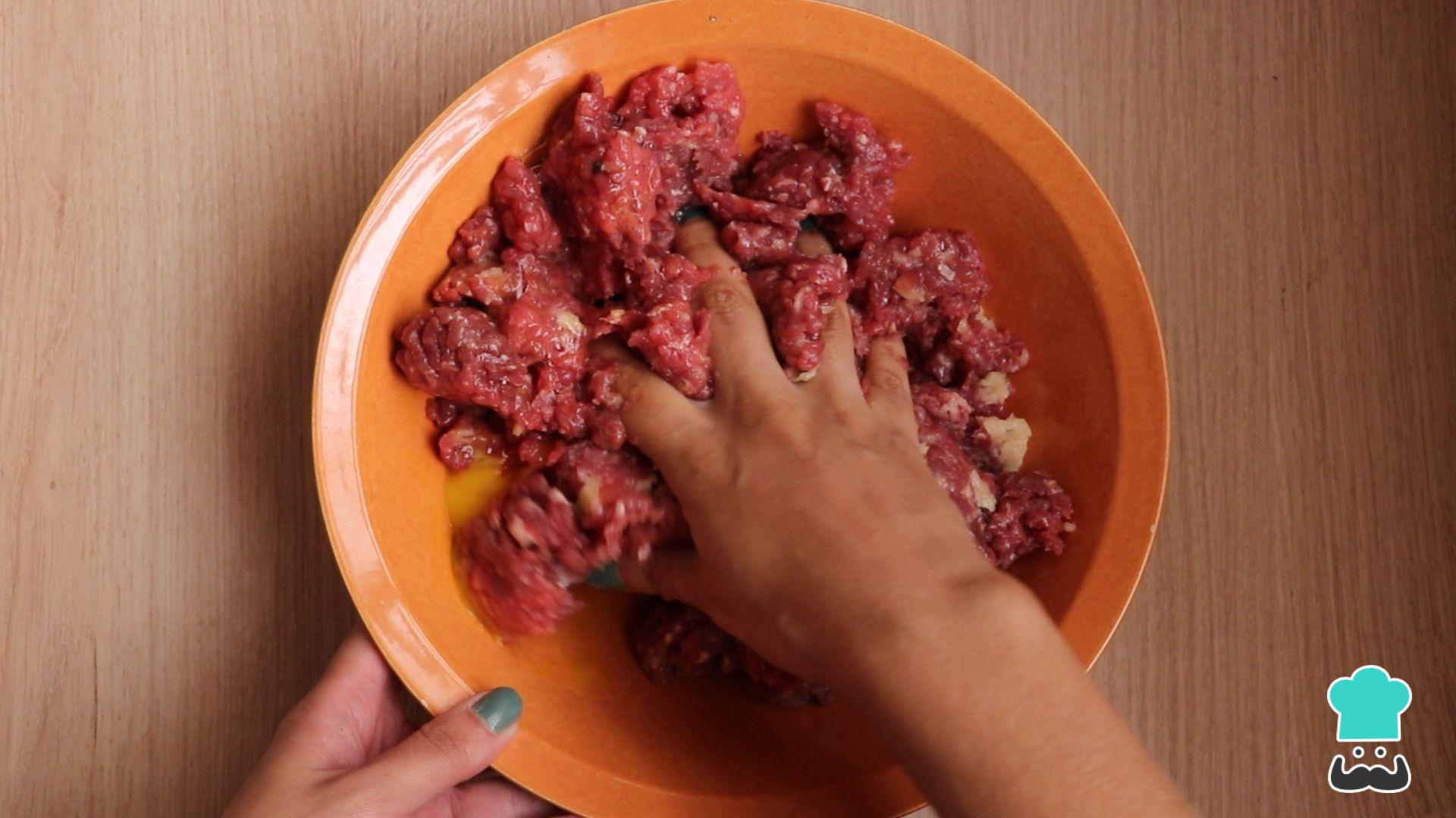 Em uma tigela grande coloque a carne, o alho, a cebola, o ovo e tempere com sal e pimenta a gosto e misture bem com as mãos.