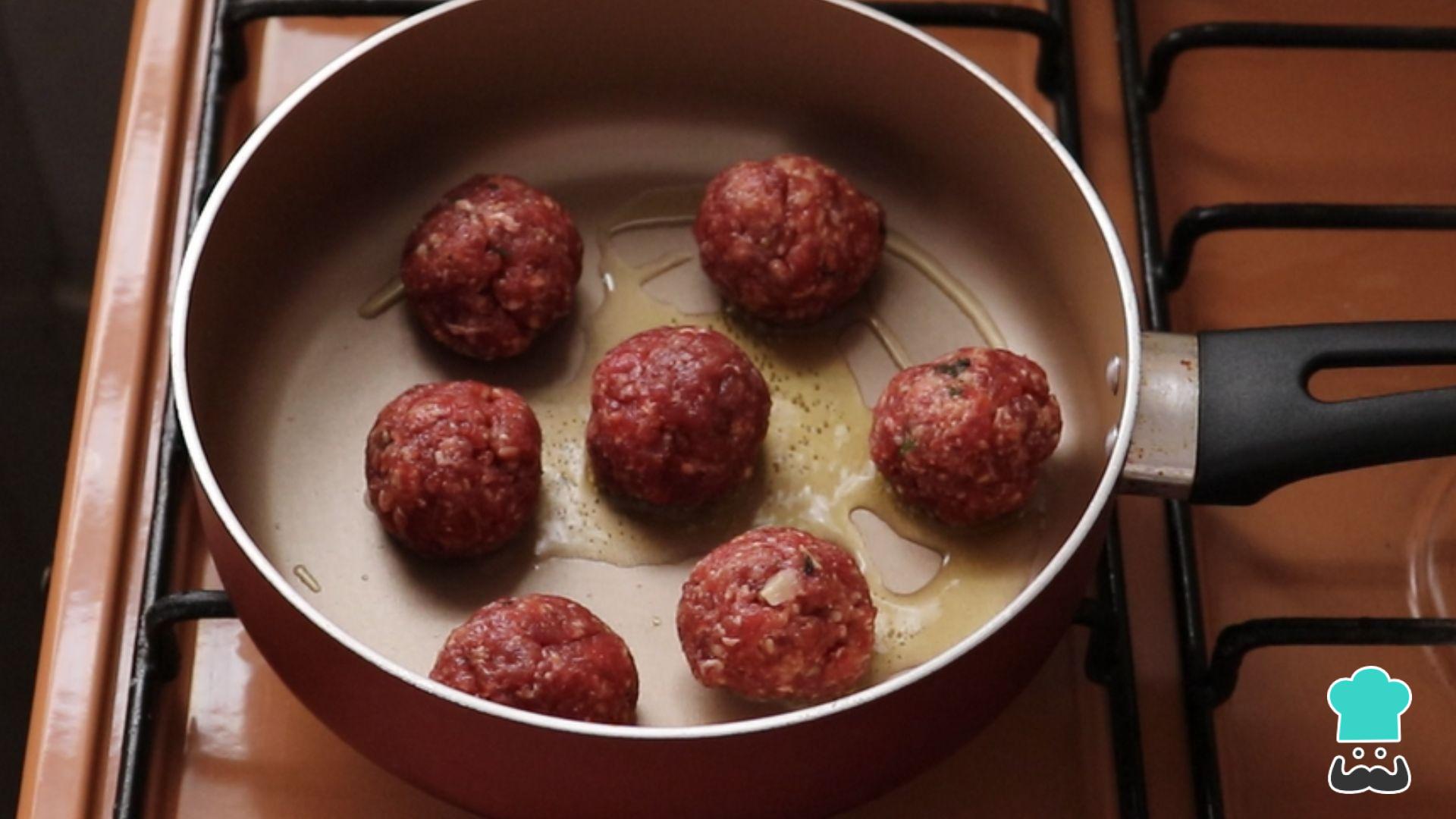 Leve uma frigideira ao fogo médio, adicione o azeite e doure todas as almôndegas.