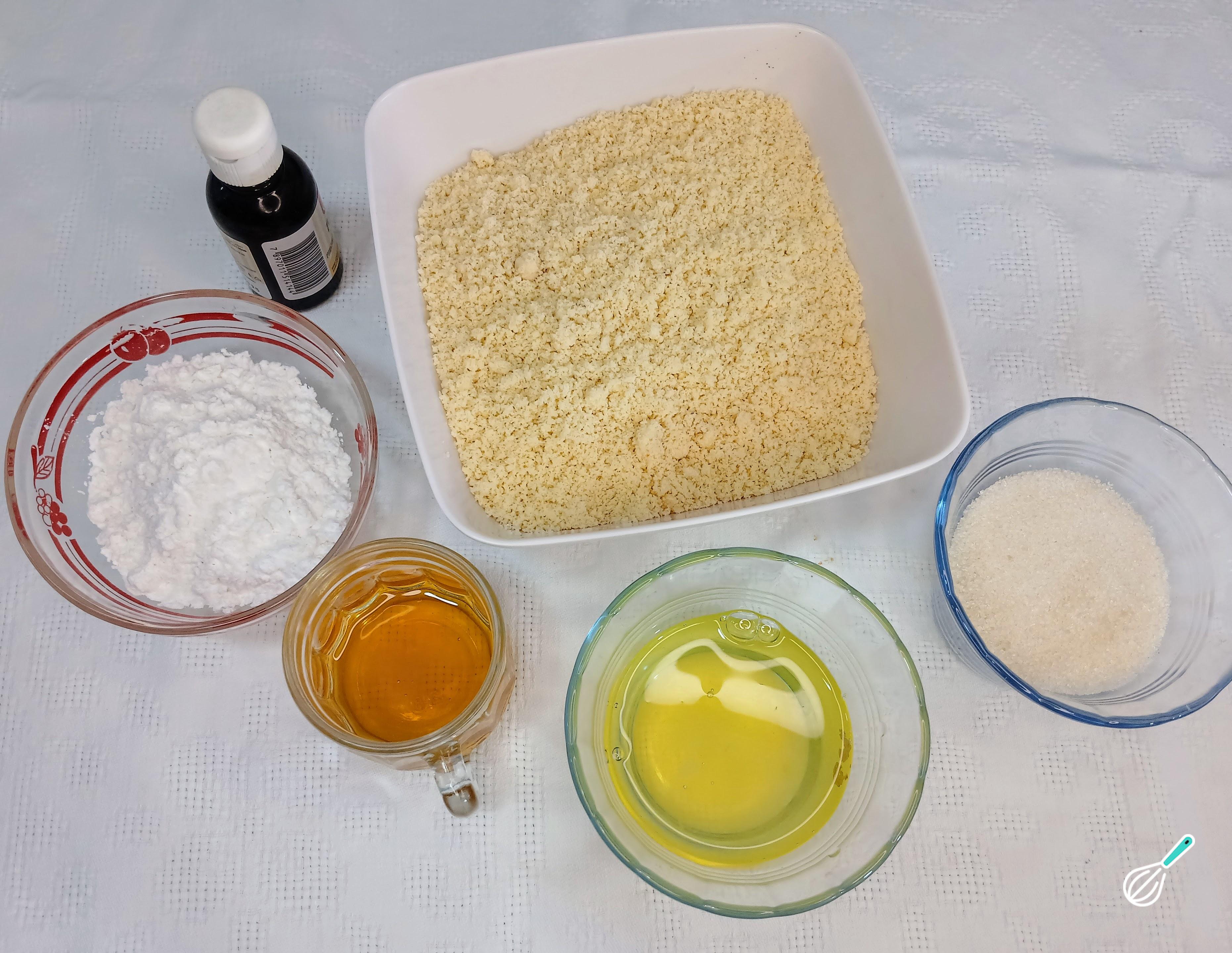 Comece separando os ingredientes para o preparo do seu biscoito amaretti. Separe a farinha de amêndoas, as claras de ovos, o açúcar impalpável, o açúcar comum, a essência de amêndoas e o mel.