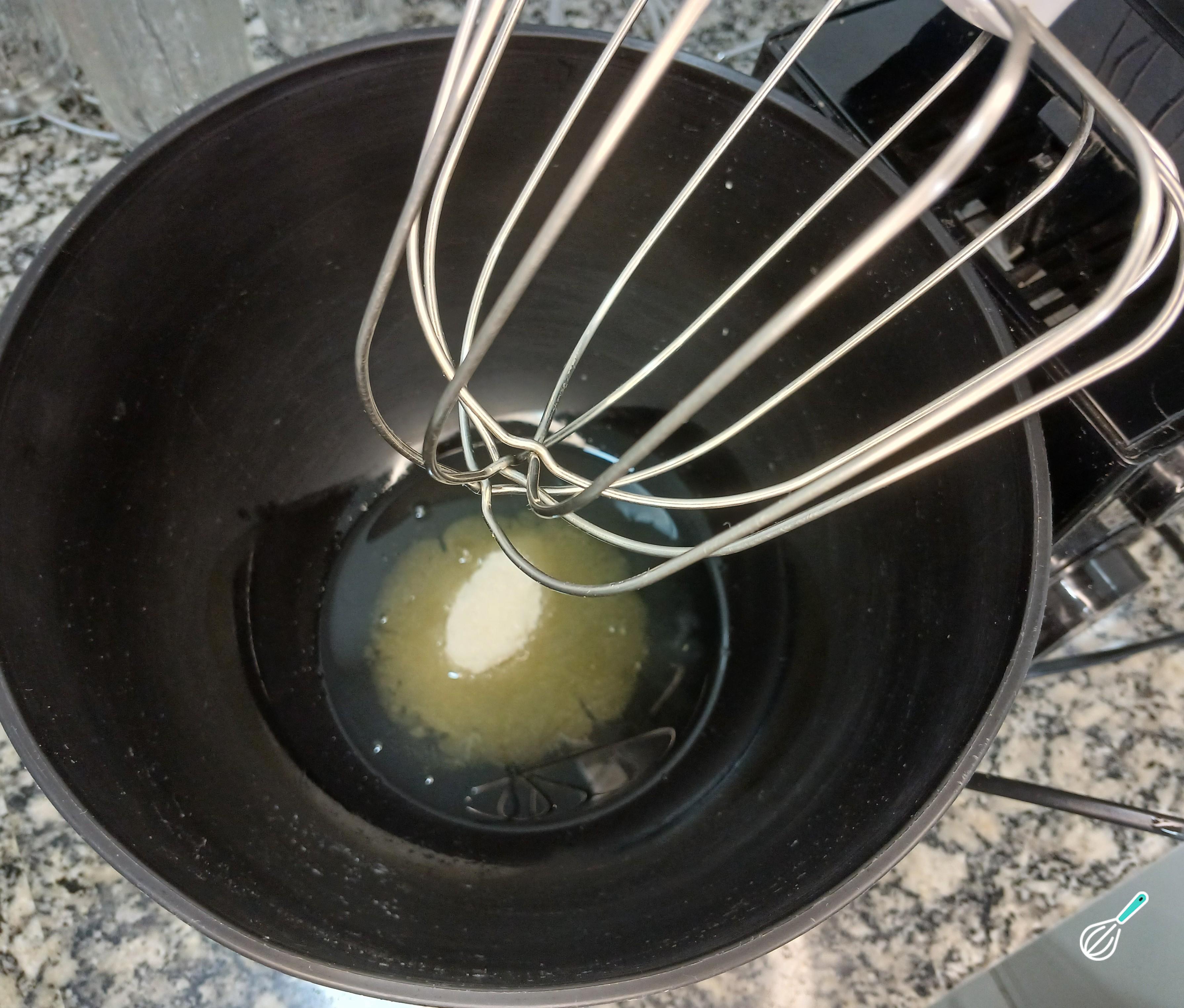 Feito isso, coloque no bowl da batedeira as claras e a metade do açúcar. Bata em velocidade média e vá acrescentando a outra parte do açúcar aos poucos.