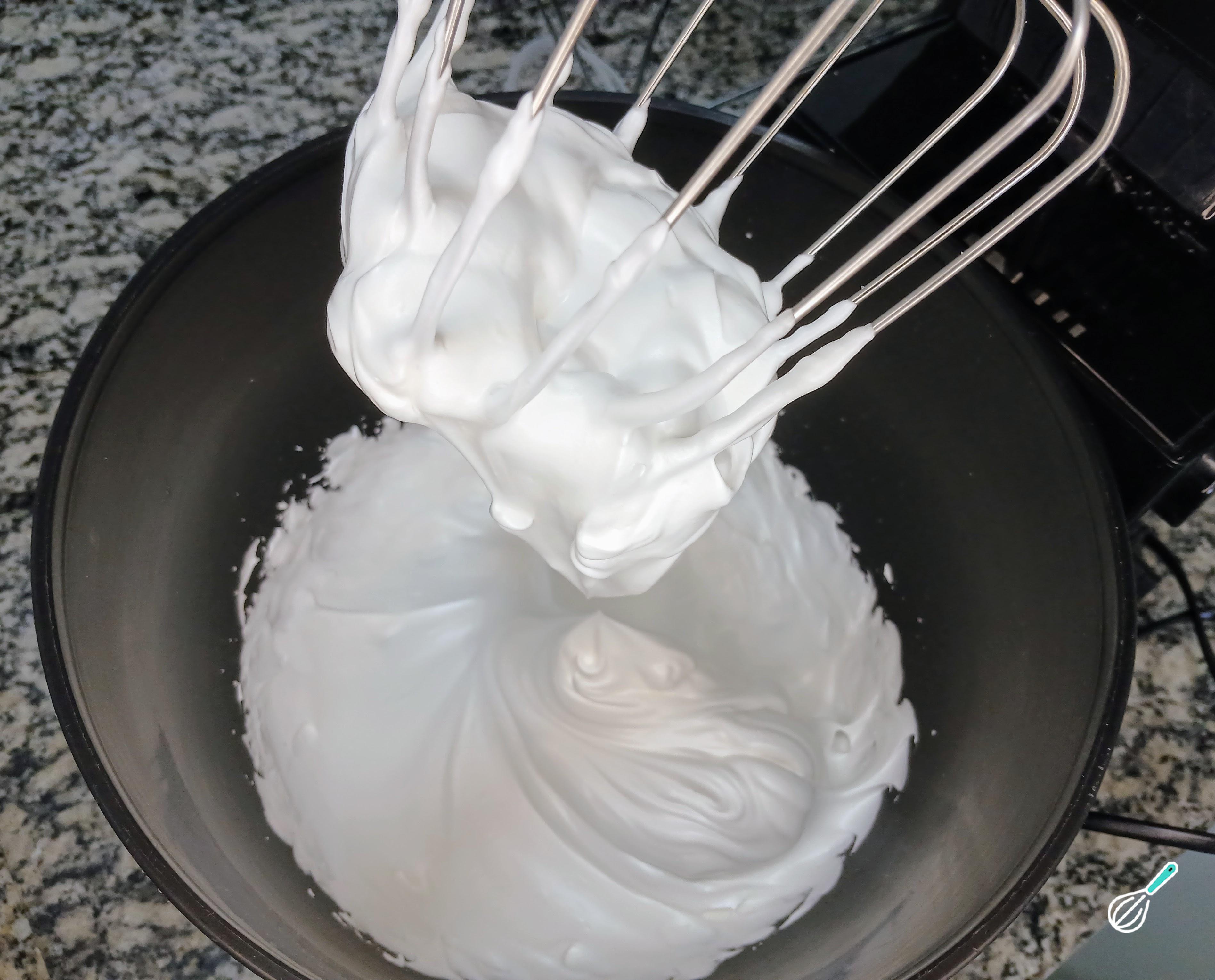 Bata até obter um ponto de castelo ou suspiro. É essencial que as claras sejam batidas nesse ponto para que a receita dê certo.