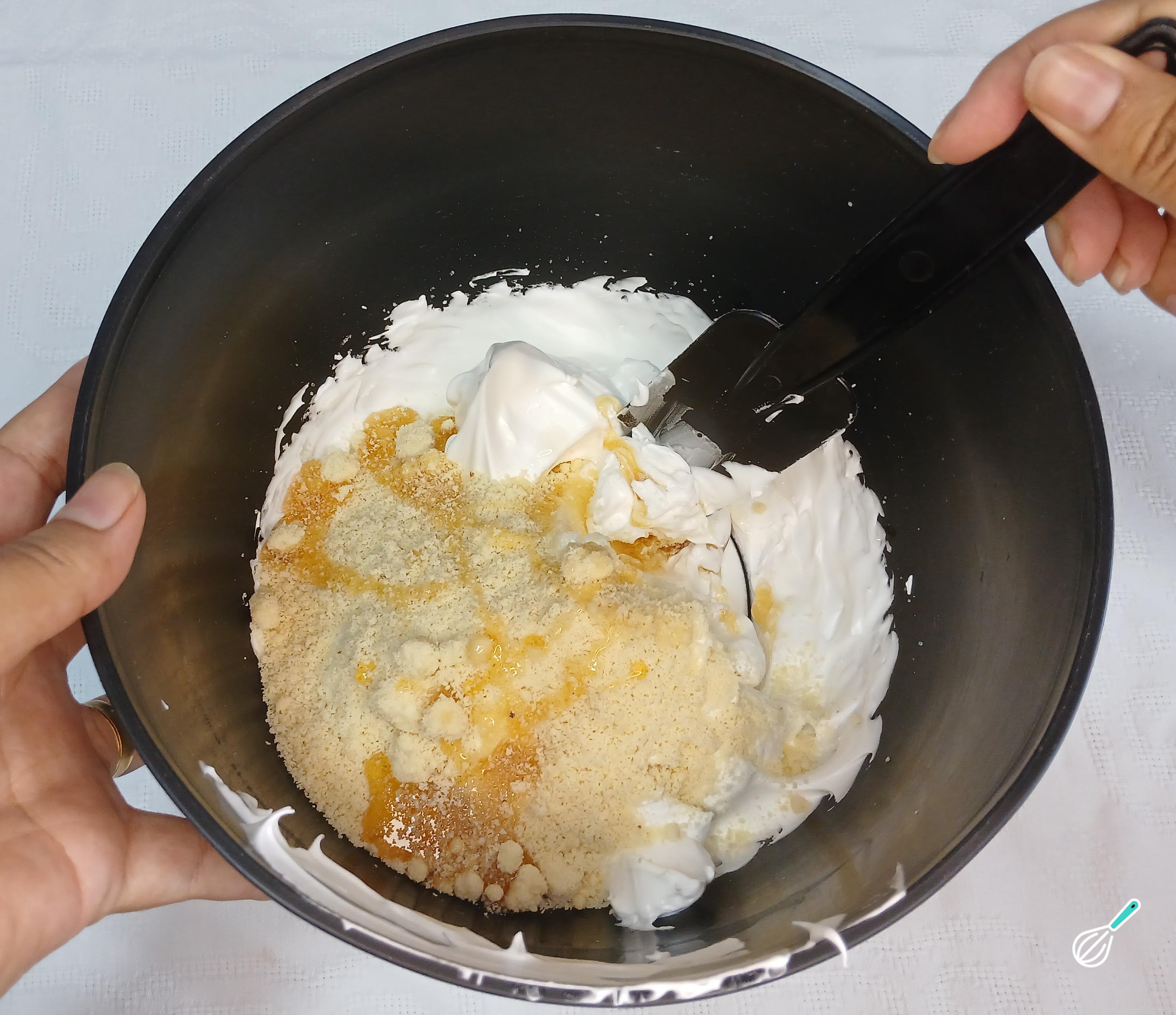 Feito isso, retire o bowl da batedeira e acrescente a farinha de amêndoas, o mel, a essência de amêndoas. Com o auxílio de uma espátula, misture muito bem a farinha de amêndoas ás claras batidas. Mexa de baixo para cima, delicadamente.