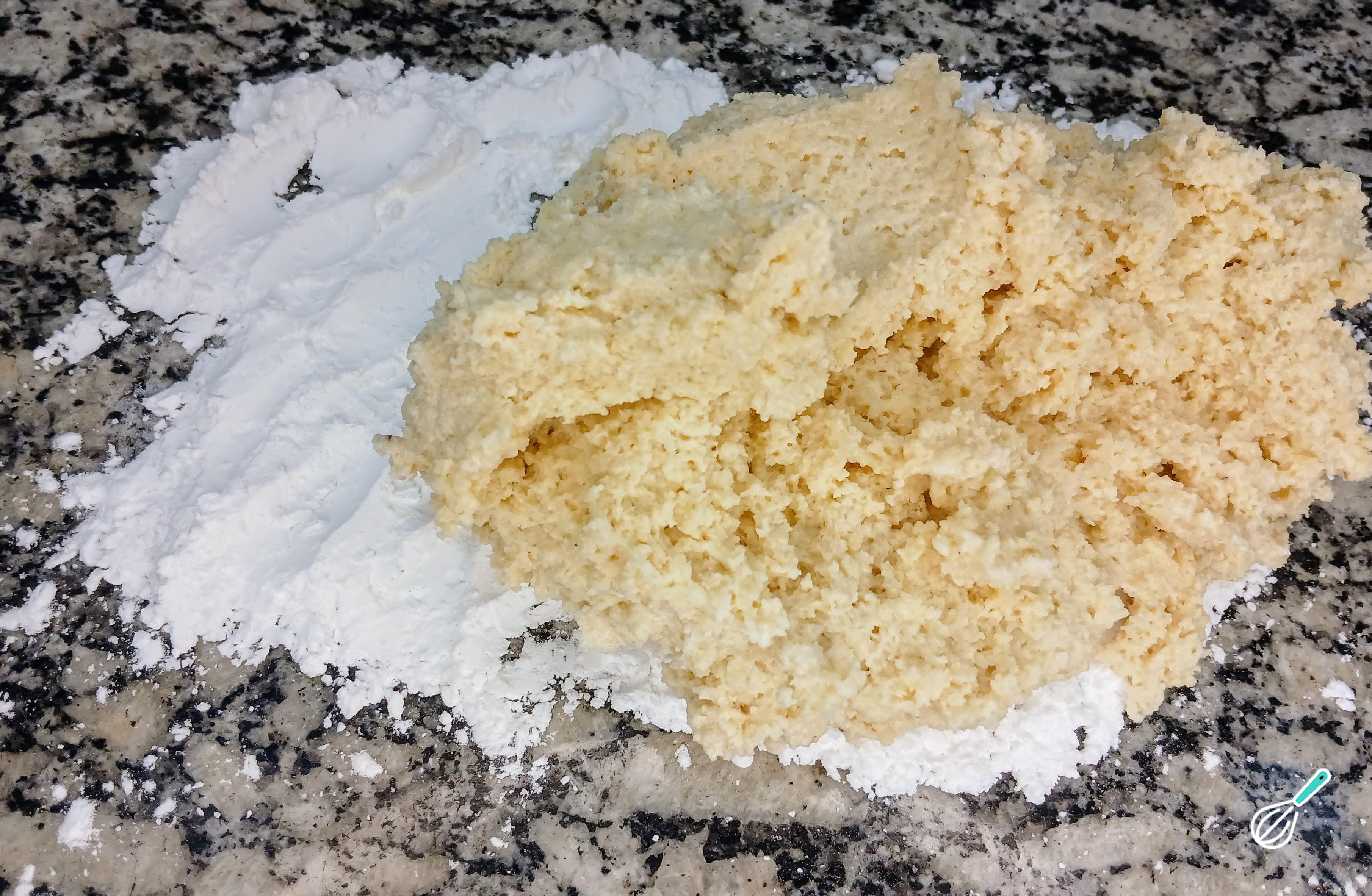 Depois disso, corte as tirinhas e faça bolinhas ou quadrados. Coloque açúcar impalpável em uma vasilha alta e coloque os biscoitos dentro, mexendo para que o açúcar grude. Depois disso coloque os biscoitos em uma assadeira antiaderente e pré-aqueça o forno a 180 graus. Leve os biscoitos para assarem por aproximadamente 20 a 25 minutos ou até dourarem por baixo e craquelarem por cima.