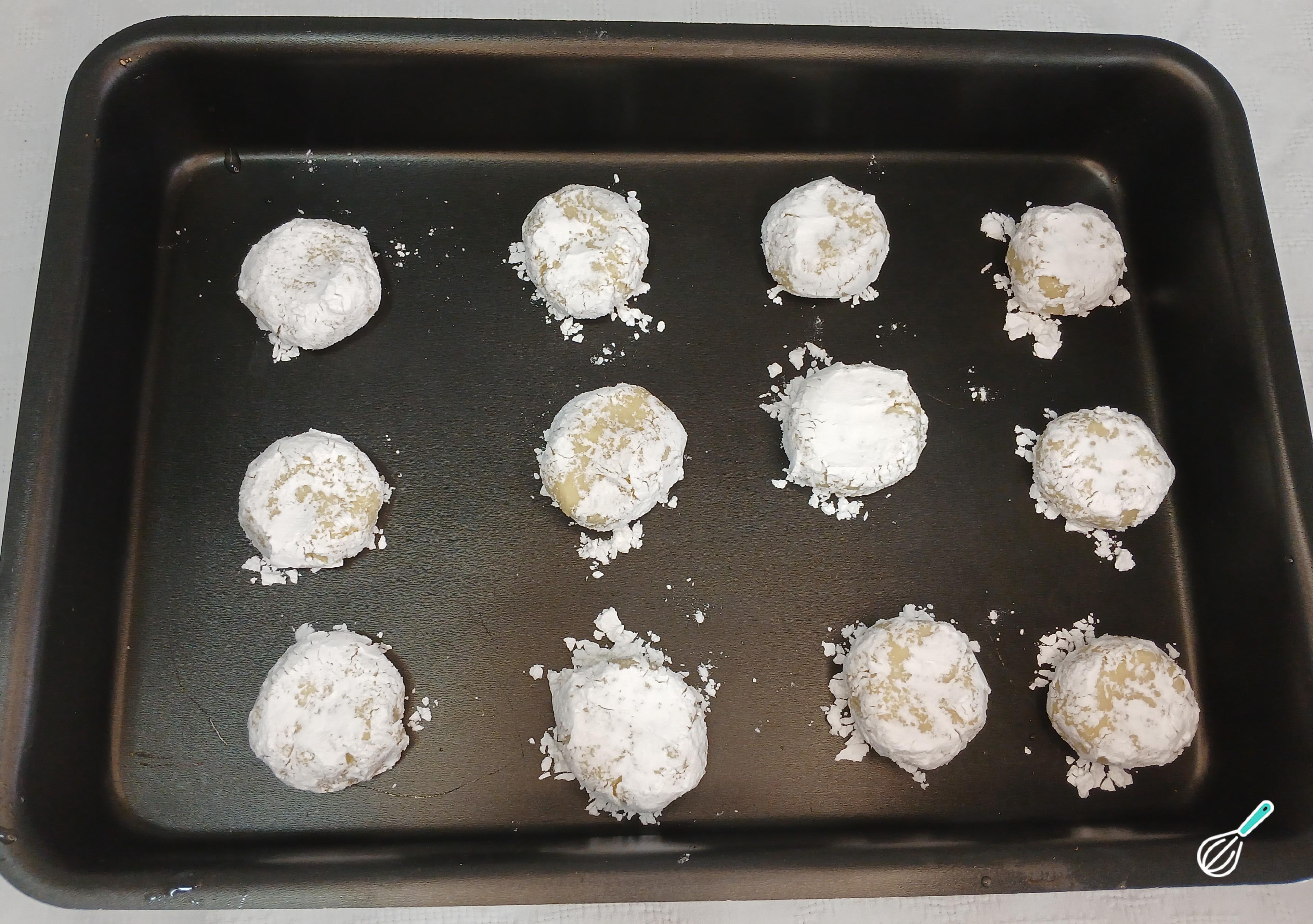 Dica: não passe óleo ou manteiga nas mãos, pois o óleo ou manteiga dificulta que o açúcar impalpável grude nos biscoitos.