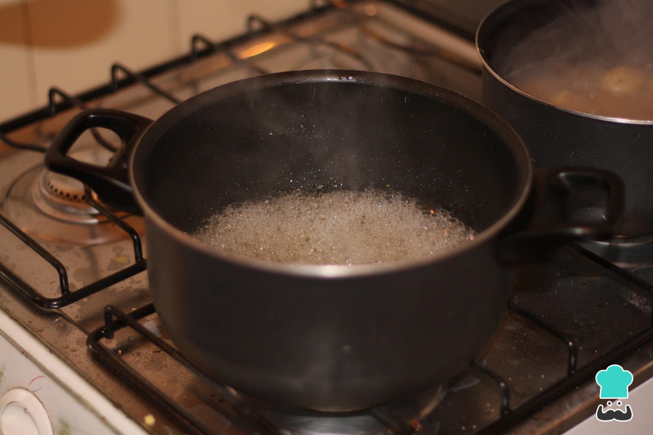 O primeiro passo da ambrosia gaúcha é preparar uma calda de açúcar. Para isso leve ao fogo baixo 1 xícara da medida de açúcar e, quando derreter, junte a água aos poucos. Quando ferver, desligue o fogo e reserve.