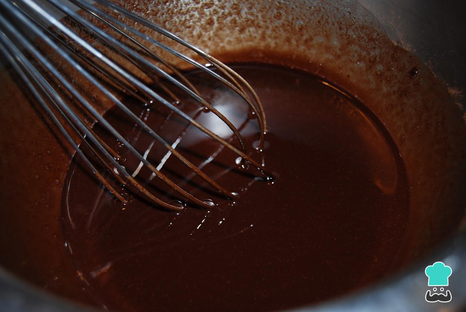 O primeiro passo desta receita fácil de amêndoas de chocolate é levar ao fogo médio uma panela com o mel, o cacau e a água. Fique mexendo até virar uma calda espessa.