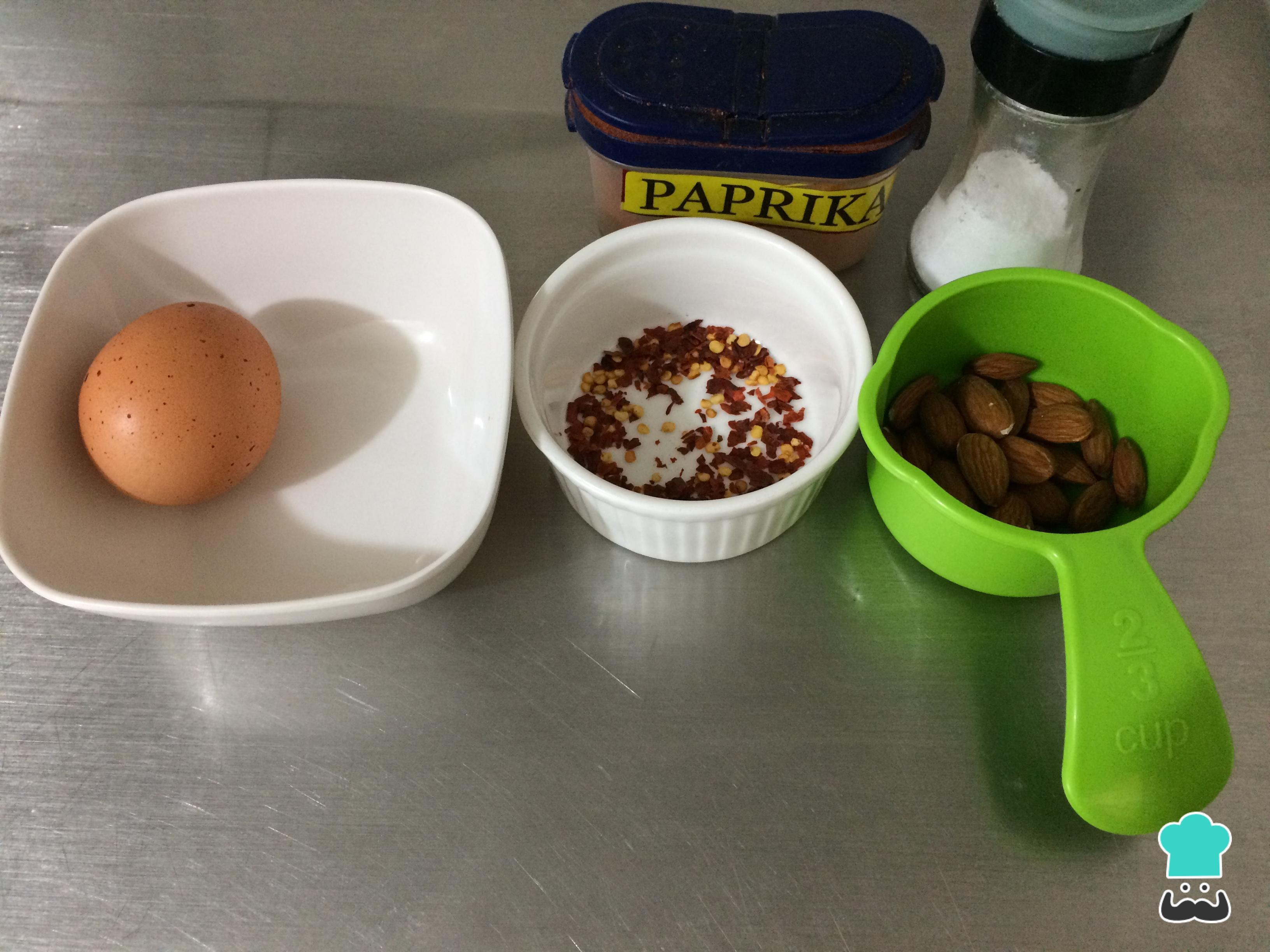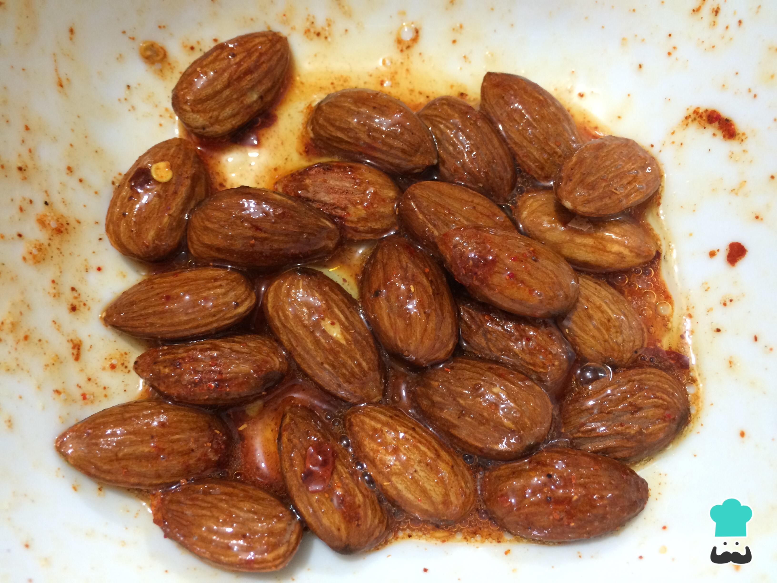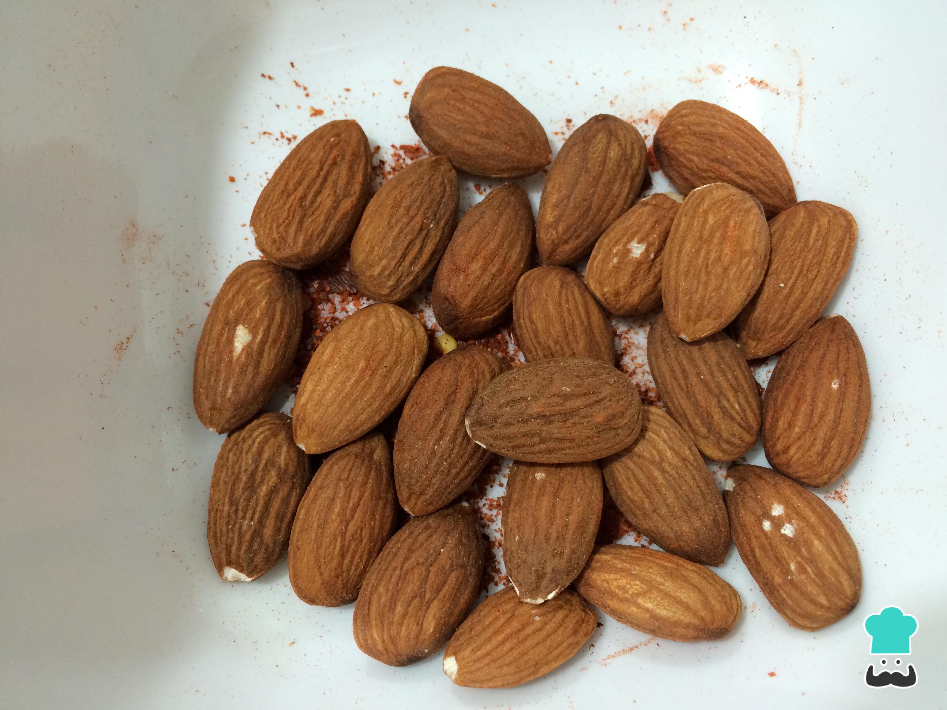 Em uma tigela misture as amêndoas com os temperos: a páprica, a pimenta calabresa e o sal.