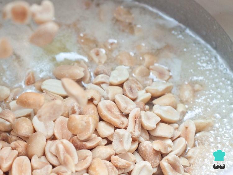 Para fazer esta receita de amendoim com sal caseiro, comece por torrar os amendoins numa frigideira ou panela grande sem óleo, mexendo de vez em quando, até que fiquem dourados e comece cheirando a amendoim (5 minutos deverão ser suficientes).