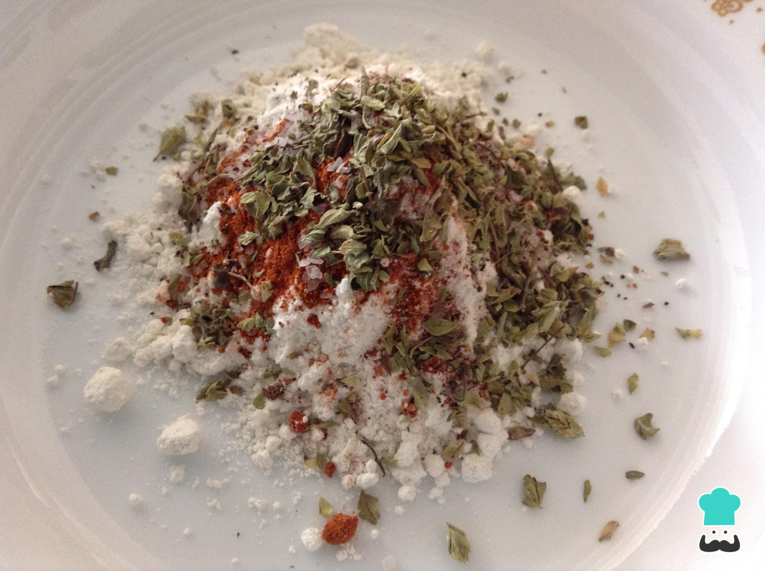 Em uma tigela adicione a farinha de trigo, sal, pimenta, a páprica e toque secreto desta receita: uma colher de sopa de oréganos secos. Misture bem todos os ingredientes.