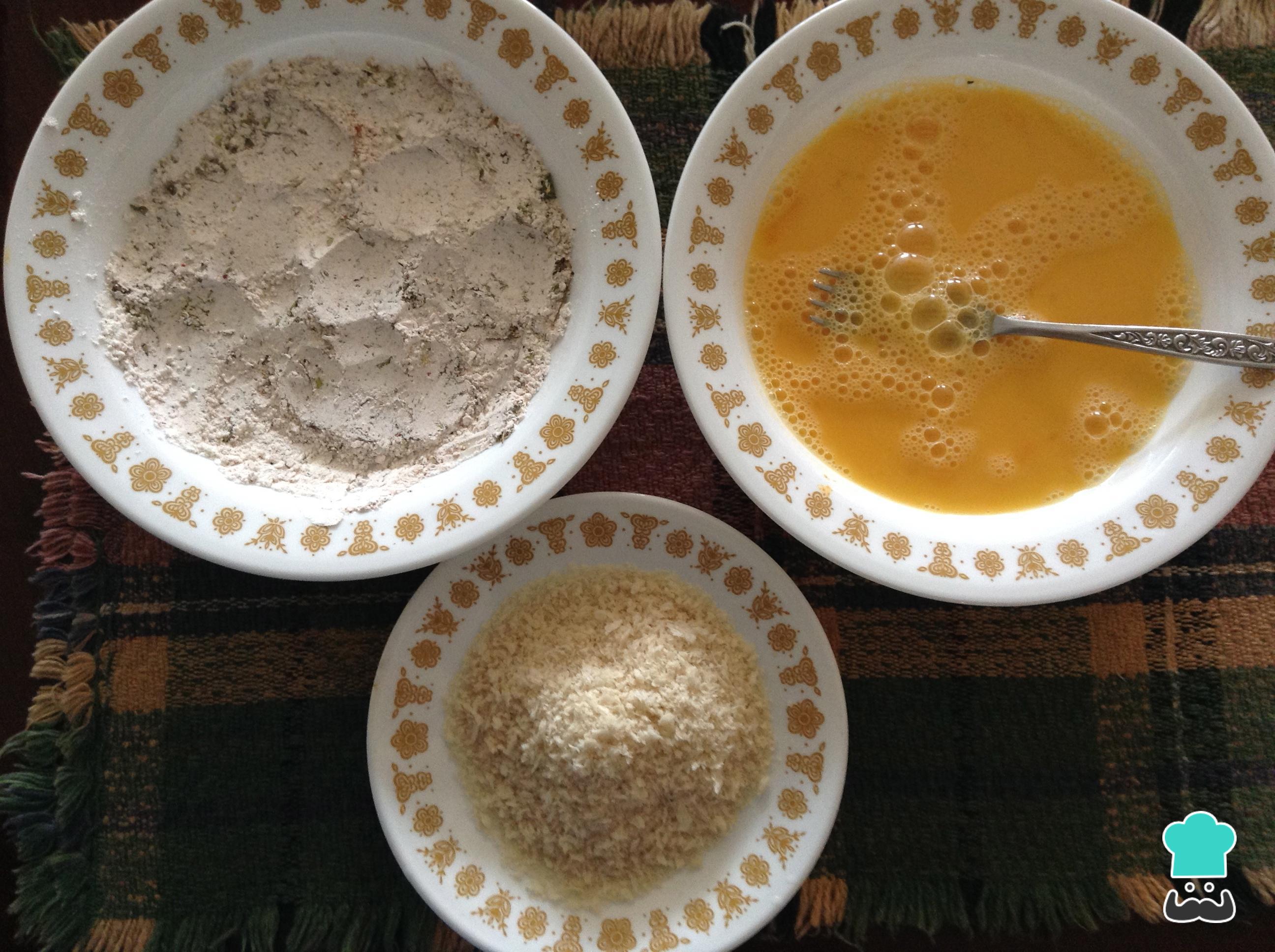 Passe os anéis de Lula primeiro pela farinha, segundo pelos ovos e terceiro pelo panko.