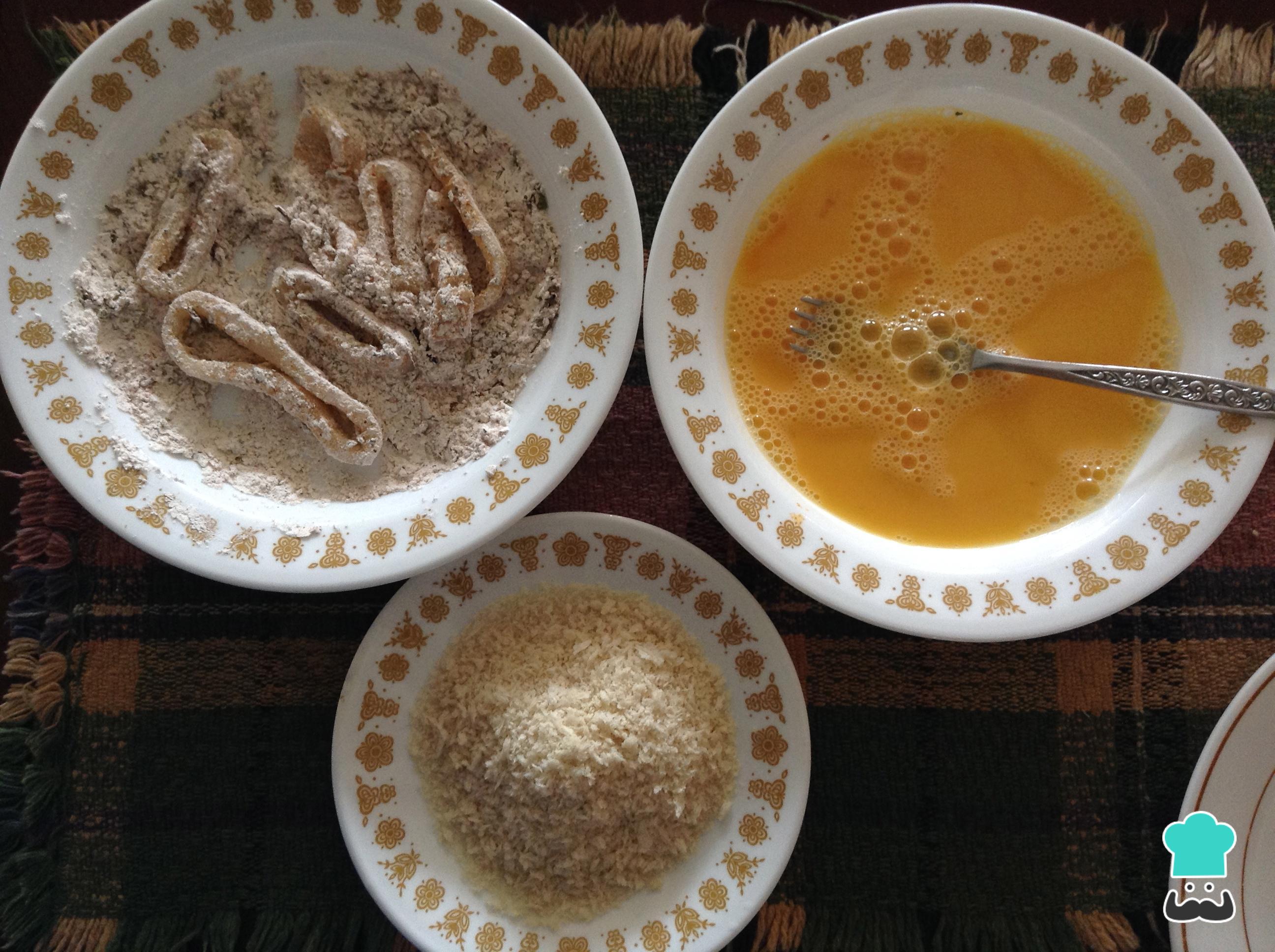 Disponha os pratos com os ingredientes para empanar as lulas: primeiro a mistura do passo anterior, segundo os ovos mexidos e o terceiro o panko.