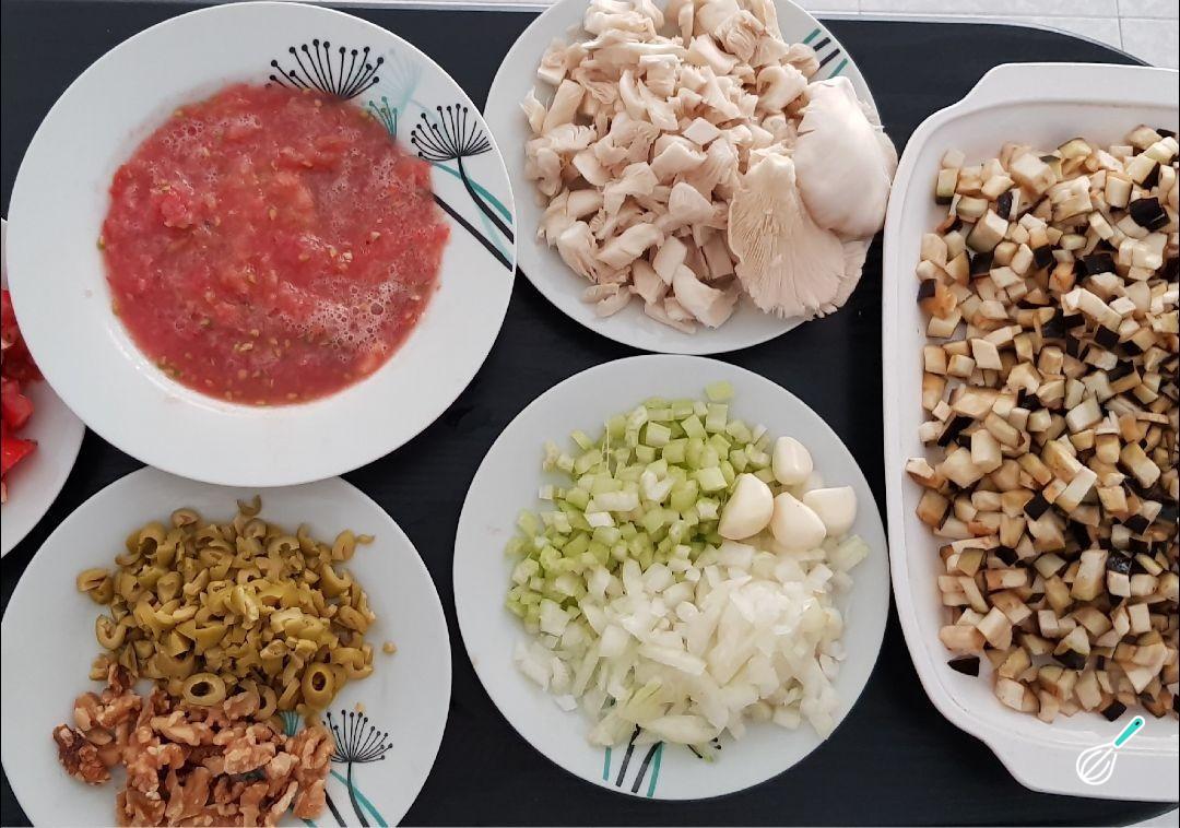 Comece por reunir os ingredientes desta receita de antepasto de berinjela na panela já devidamente preparados: pique em pedacinhos as berinjelas, as cebolas, o aipo, os cogumelos e 3 tomates. Corte as azeitonas em rodelas e bata os tomates restantes.