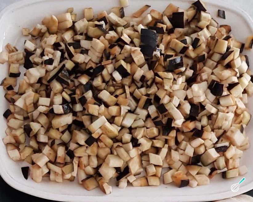 Coloque a berinjela num recipiente grande e adicione um fio de azeite e uma quantidade abundante de sal. Misture e deixe repousar por 30 minutos, para eliminar o gosto amargo. Depois coloque em um escorredor e lave com água corrente, para eliminar o sal. Deixe escorrer bem a água.