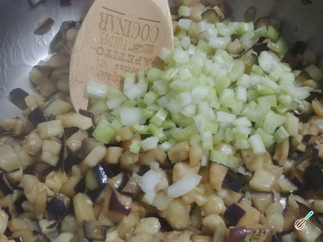 Numa panela com um fio de azeite refogue a berinjela até dourar. Depois adicione o aipo e os cogumelos e misture.