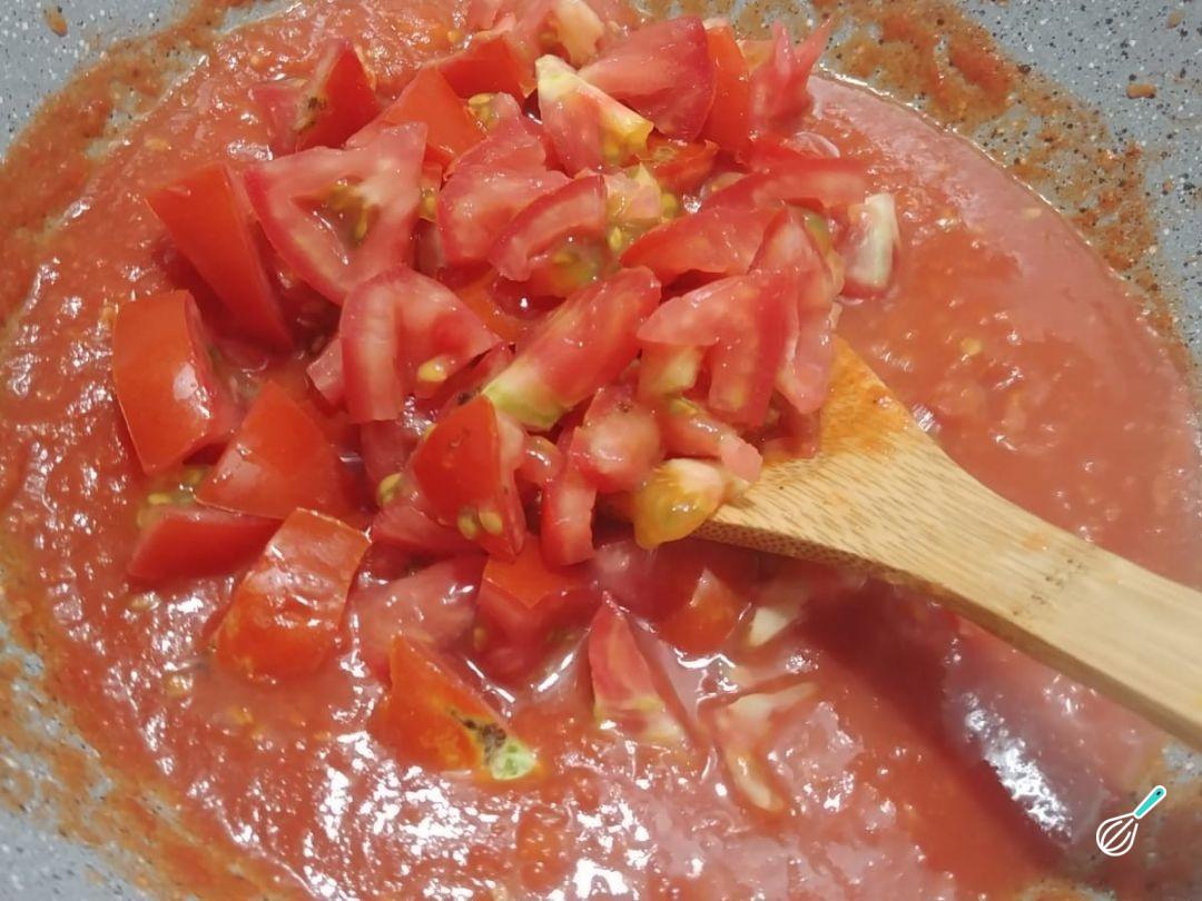 Na mesma frigideira doure os alhos e, depois, adicione o tomate triturado. Deixe cozinhar por 5-7 minutos ou até reduzir o molho. Junte o restante dos tomates e misture.