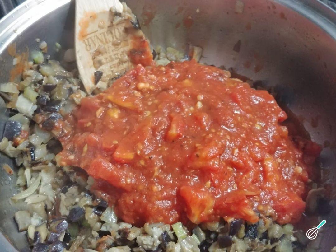 Adicione também este molho à panela das berinjelas e misture. Deixe cozinhar por mais alguns minutos.