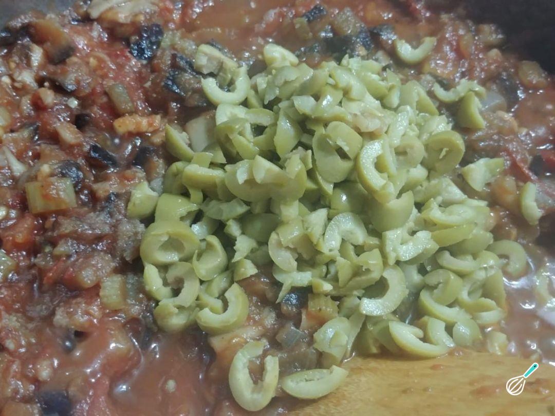 O passo seguinte desta receita de antepasto de berinjela de panela é adicionar à panela os restantes ingredientes: o açúcar, o vinagre, o sal, a pimenta, as azeitonas, as alcaparras e as nozes. Misture tudo e cozinhe por 5 minutos mexendo de vez em quando. Depois tampe, desligue o fogo e deixe repousar por 10 minutos.