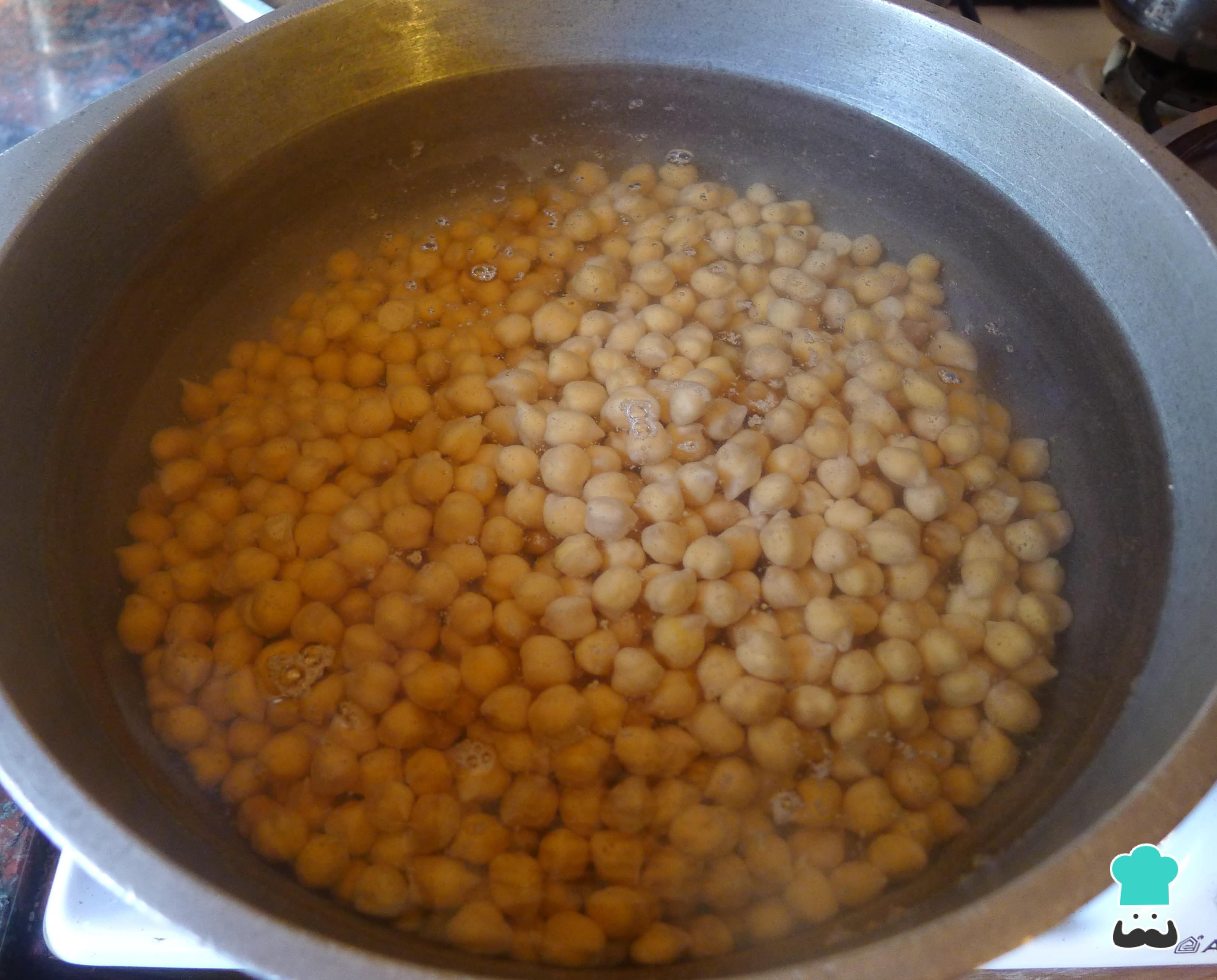 Quando o grão-de-bico estiver cozido, retire 3/4 da água da cozedura e leve ao fogo até reduzir para metade.