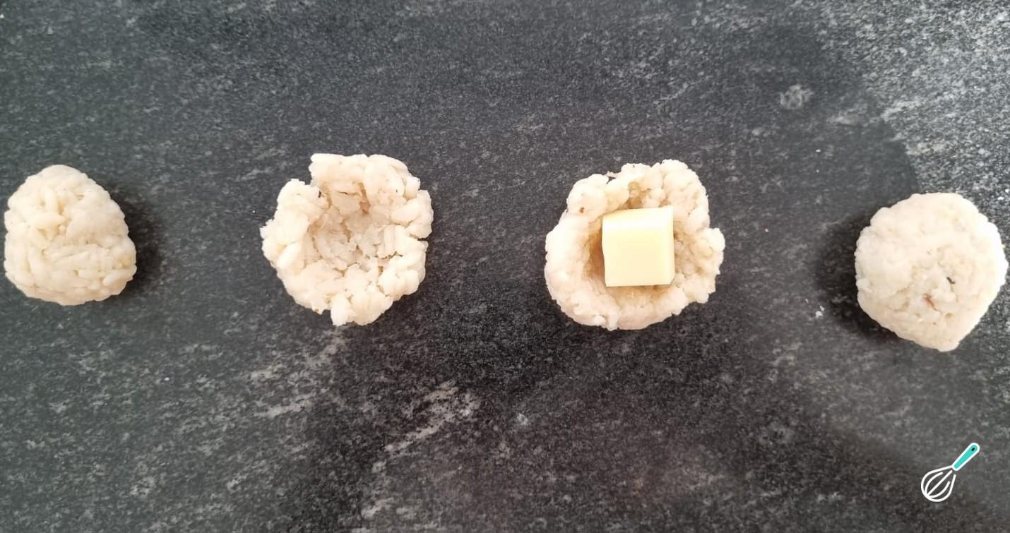 Antes de começar, faça uma bolinha com o arroz e aperte para tirar todo o ar, em seguida abra, coloque o queijo e feche, apertando bem para garantir que esteja bem compactado.
