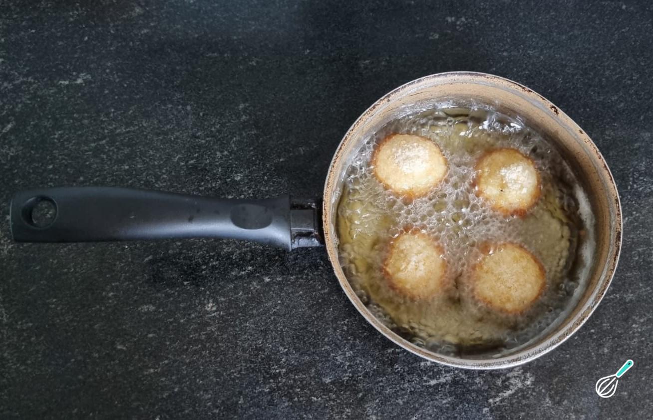 Após dourar de um lado, vire os bolinhos. Caso prefira, você também pode fazer na airfryer, coloque o bolinho no cesto, borrife óleo e asse a 180 graus por 10 minutos de cada lado.