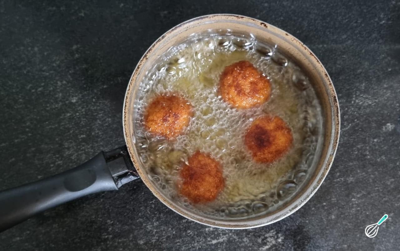 Depois que estiverem empanados, esquente o óleo. Para saber se tá na temperatura ideal, coloque um fósforo dentro do óleo, quando acender significa que está no momento de colocar os bolinhos para fritar.