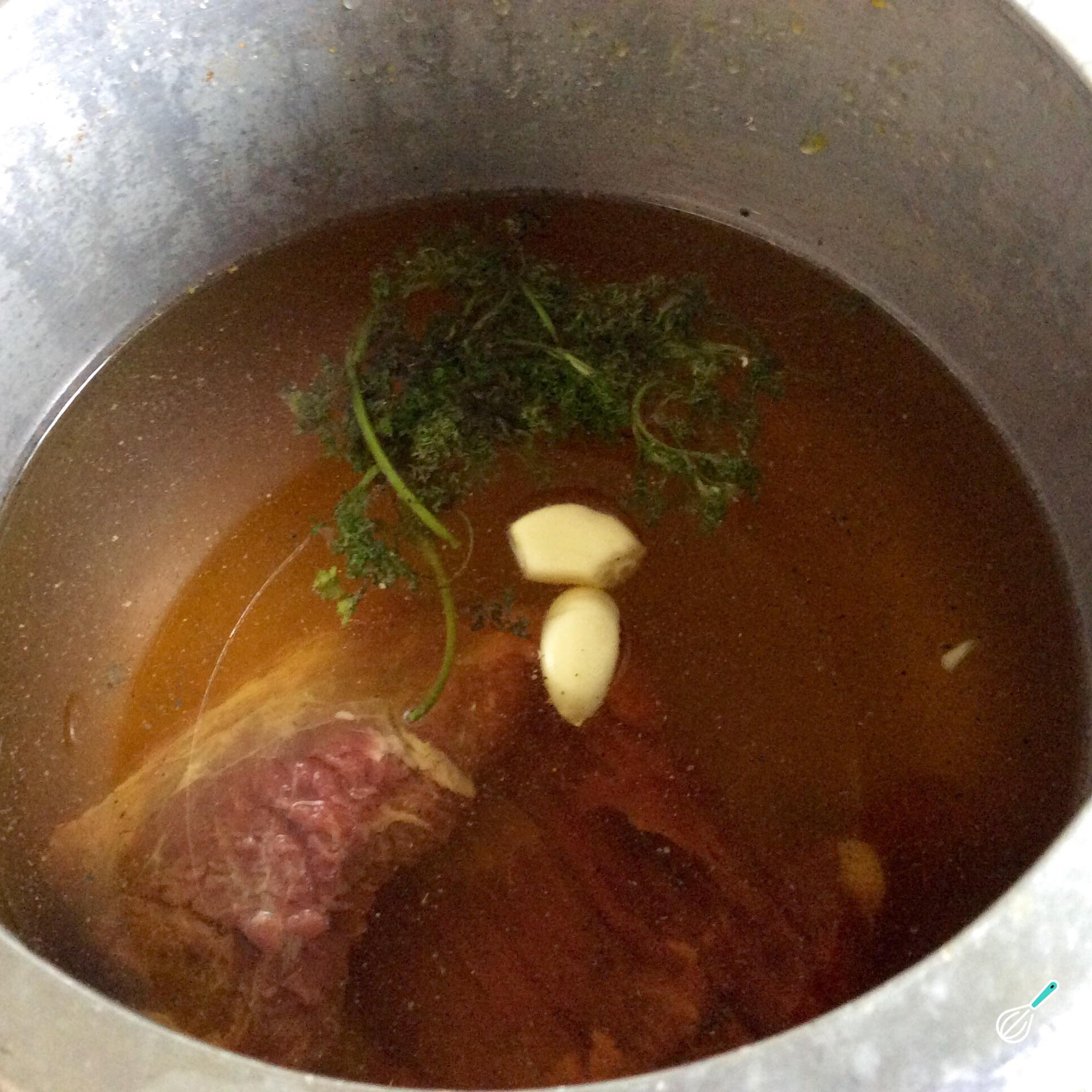 Cozinhe a carne na panela de pressão com um pouco de água, coentro, sal, pimenta e páprica e os alhos, por 30 minutos.