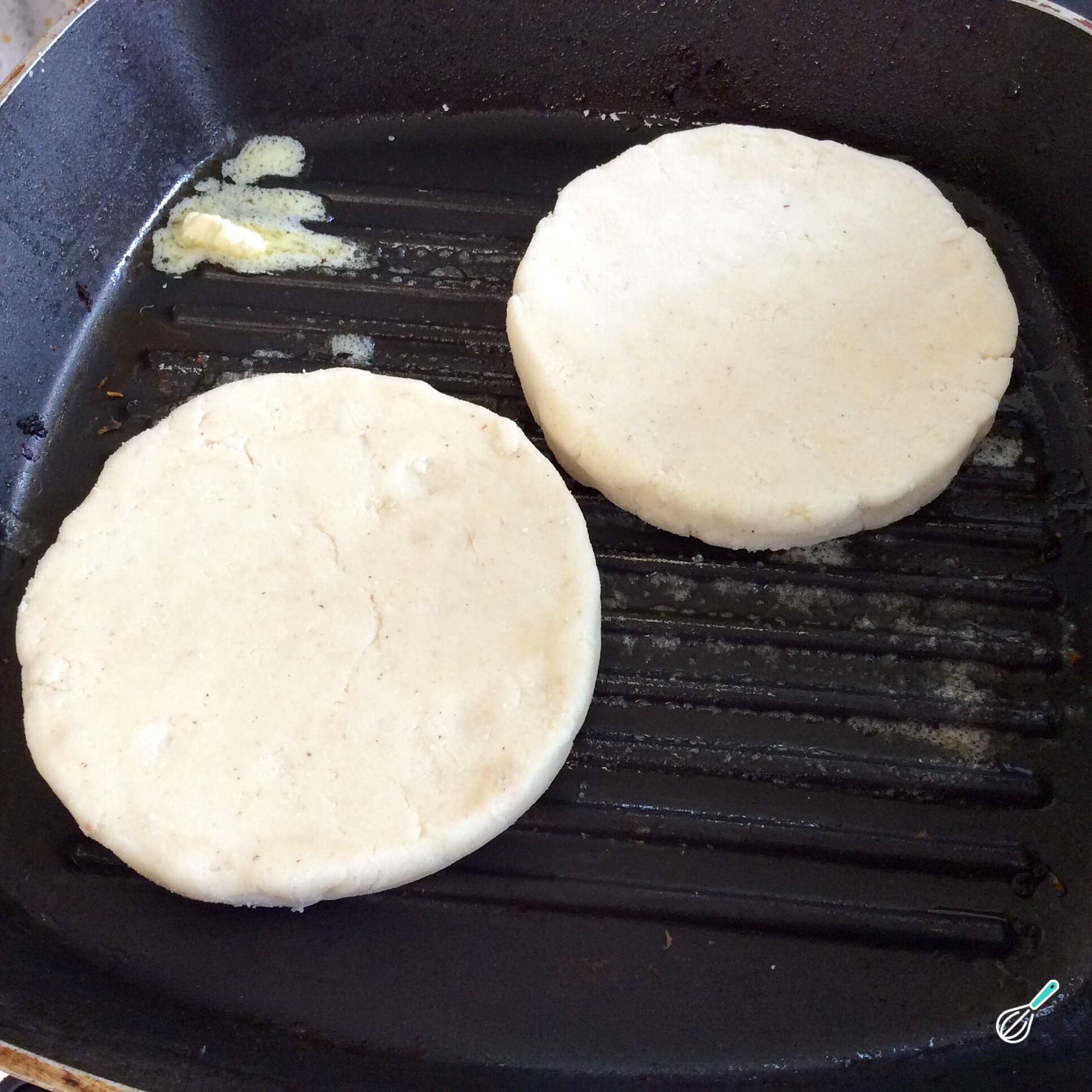 Modele discos de massa do tamanho de um prato pequeno, e um pouco grossos. Doure de um lado e do outro em um grelhador ou frigideira untado e em fogo alto.