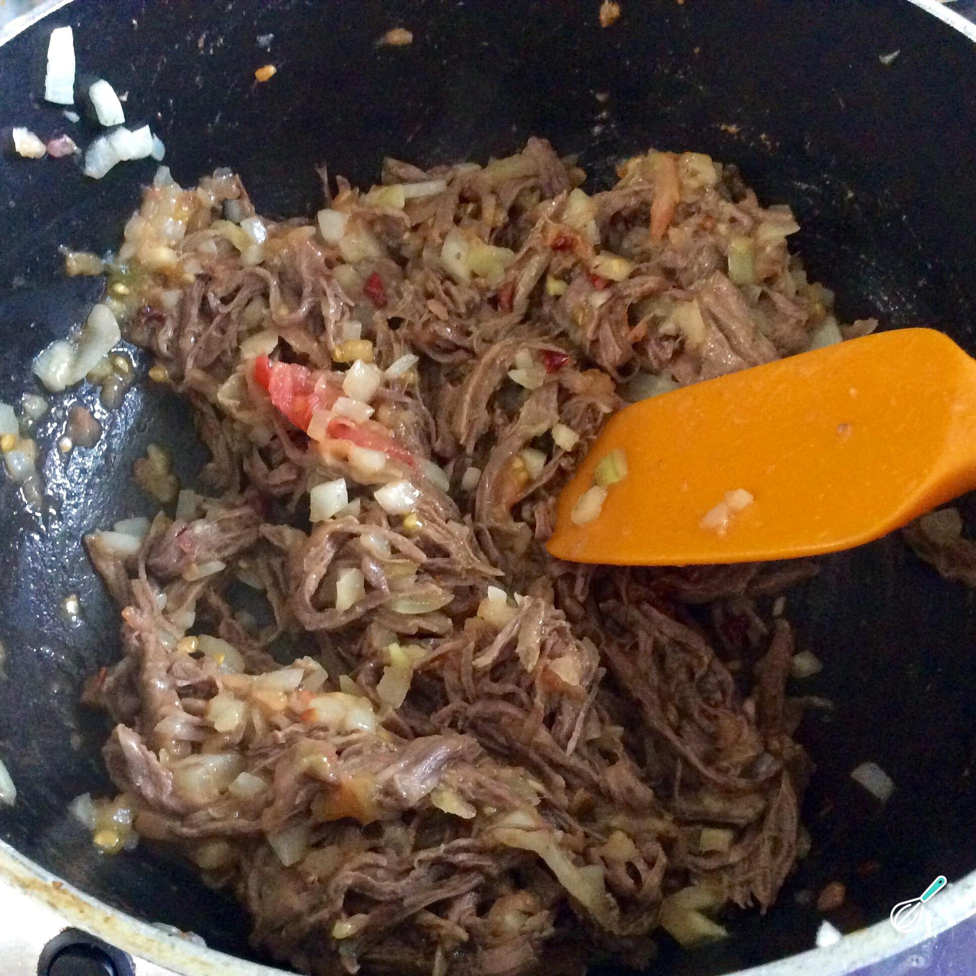 Quando a carne estiver cozinhada, retire-a da panela e deixe esfriar um pouco, para que consiga desfiar. A seguir, em uma frigideira, refogue a carne com o tomate e a cebola picados durante 3 minutos, e a acerte o sabor com sal e pimenta.