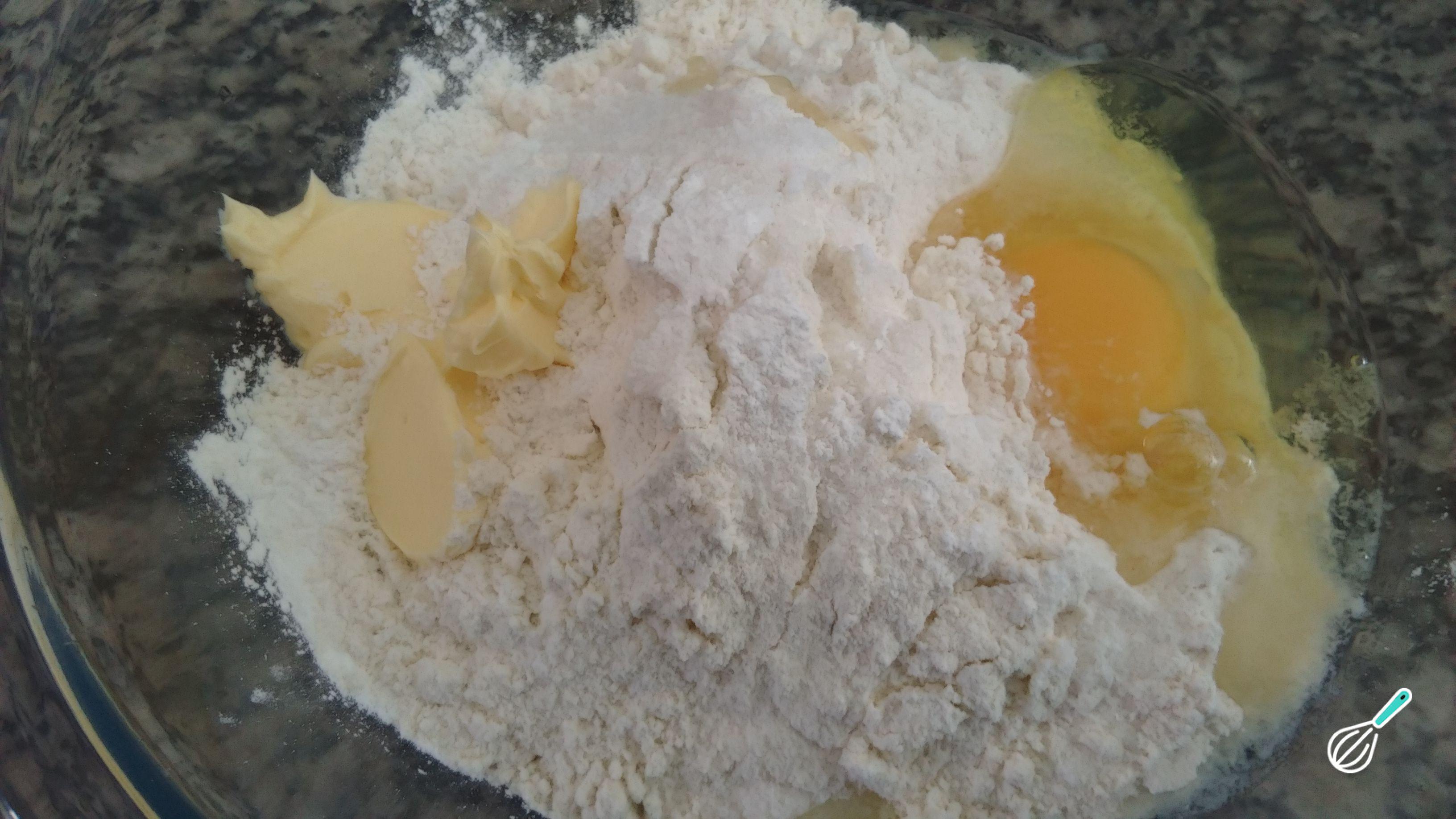 Adicione o ovo e a manteiga ou margarina em temperatura ambiente.