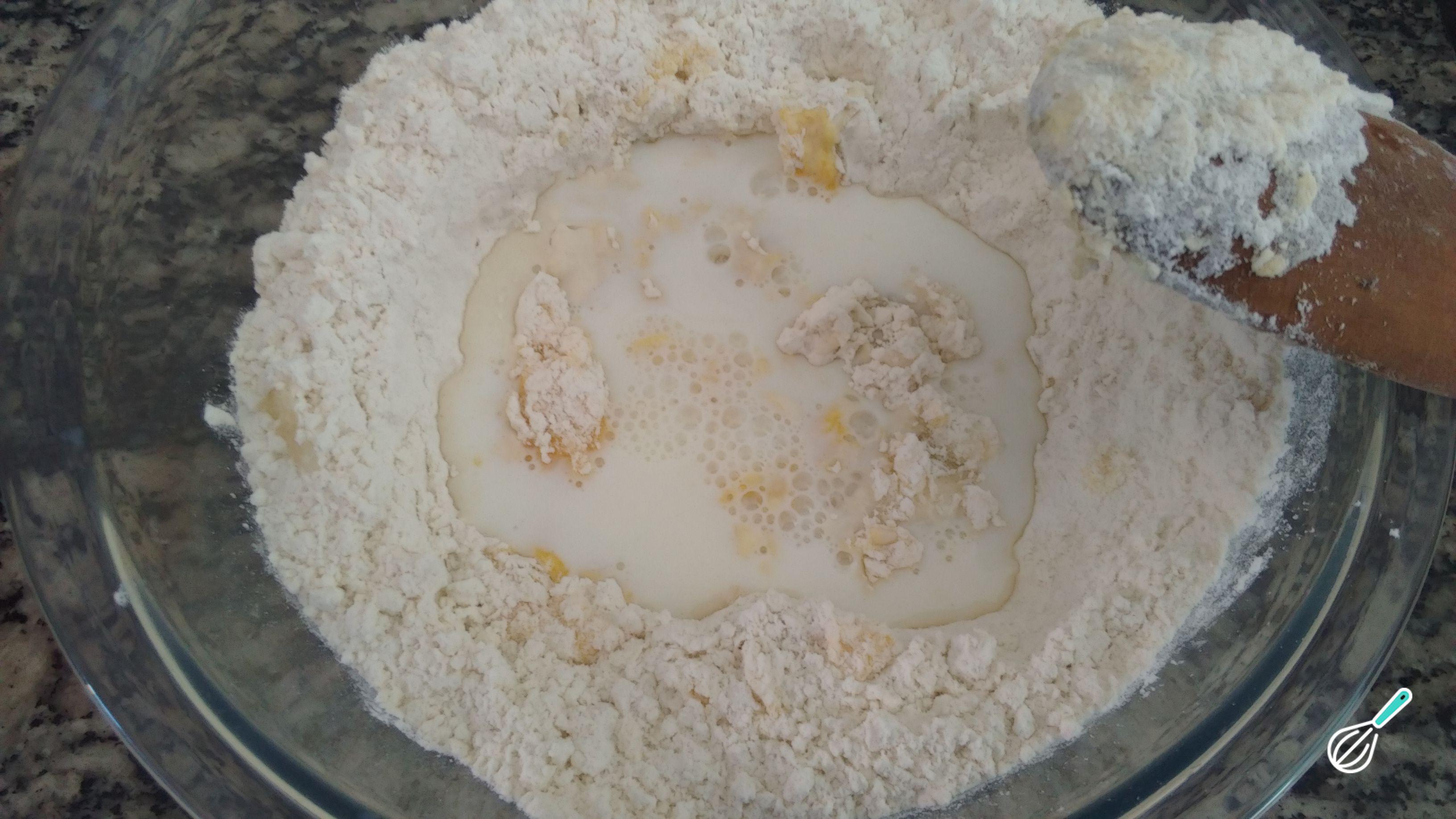 Misture um pouco e adicione o leite, de preferência em temperatura ambiente. Você pode preparar estas arepas de farinha de trigo com leite integral ou desnatado.