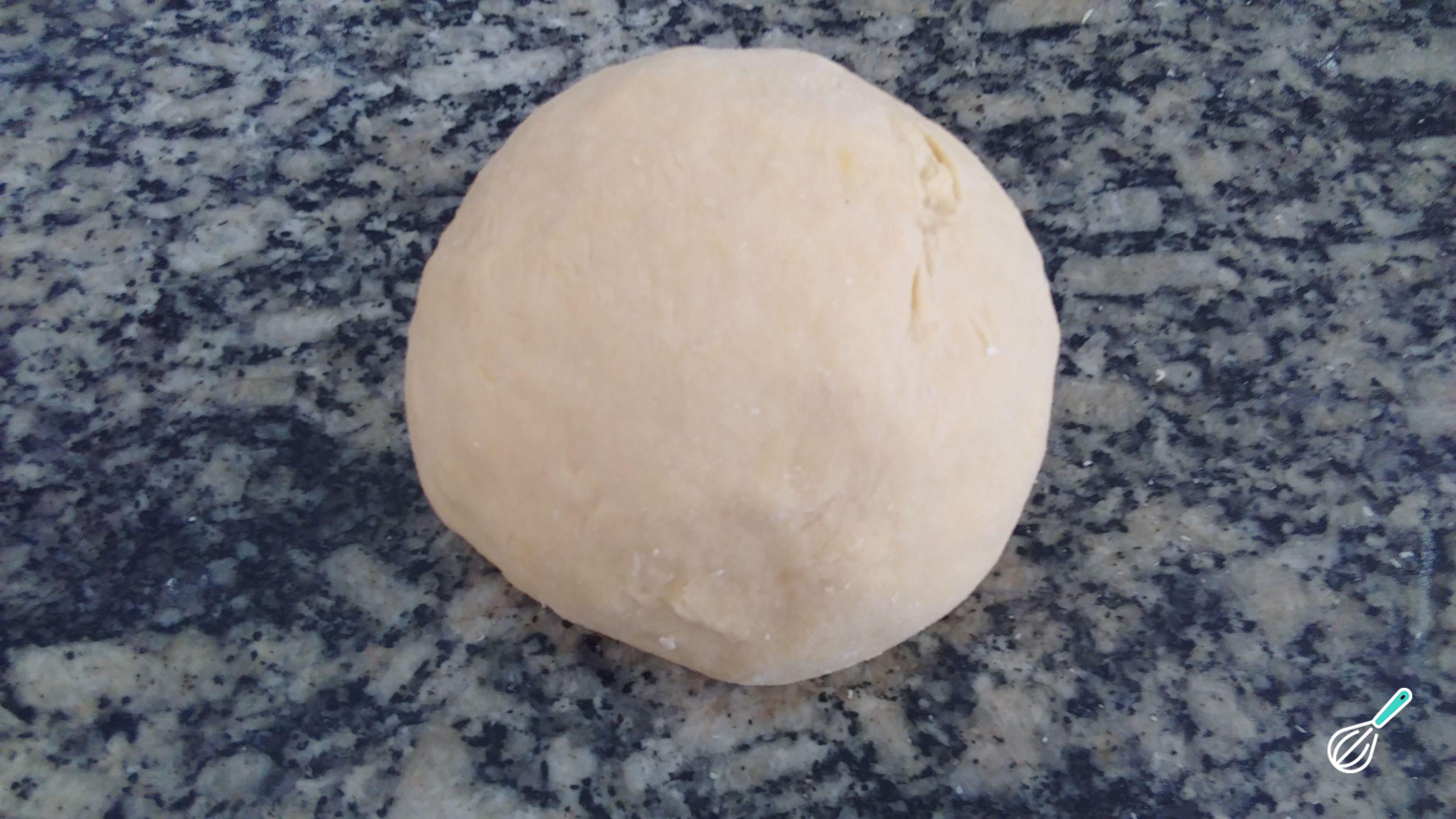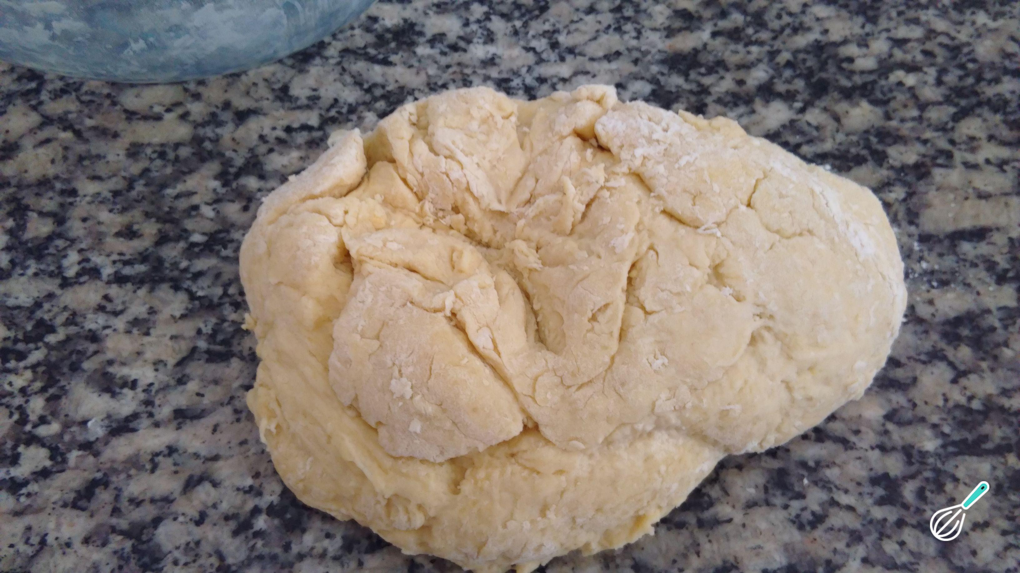 Misture todos os ingredientes até obter uma pasta mais ou menos homogênea - depois disso é normal que algumas partes da massa ainda estejam secas. Transfira a massa para uma bancada enfarinhada, amasse e sove por 5-7 minutos.