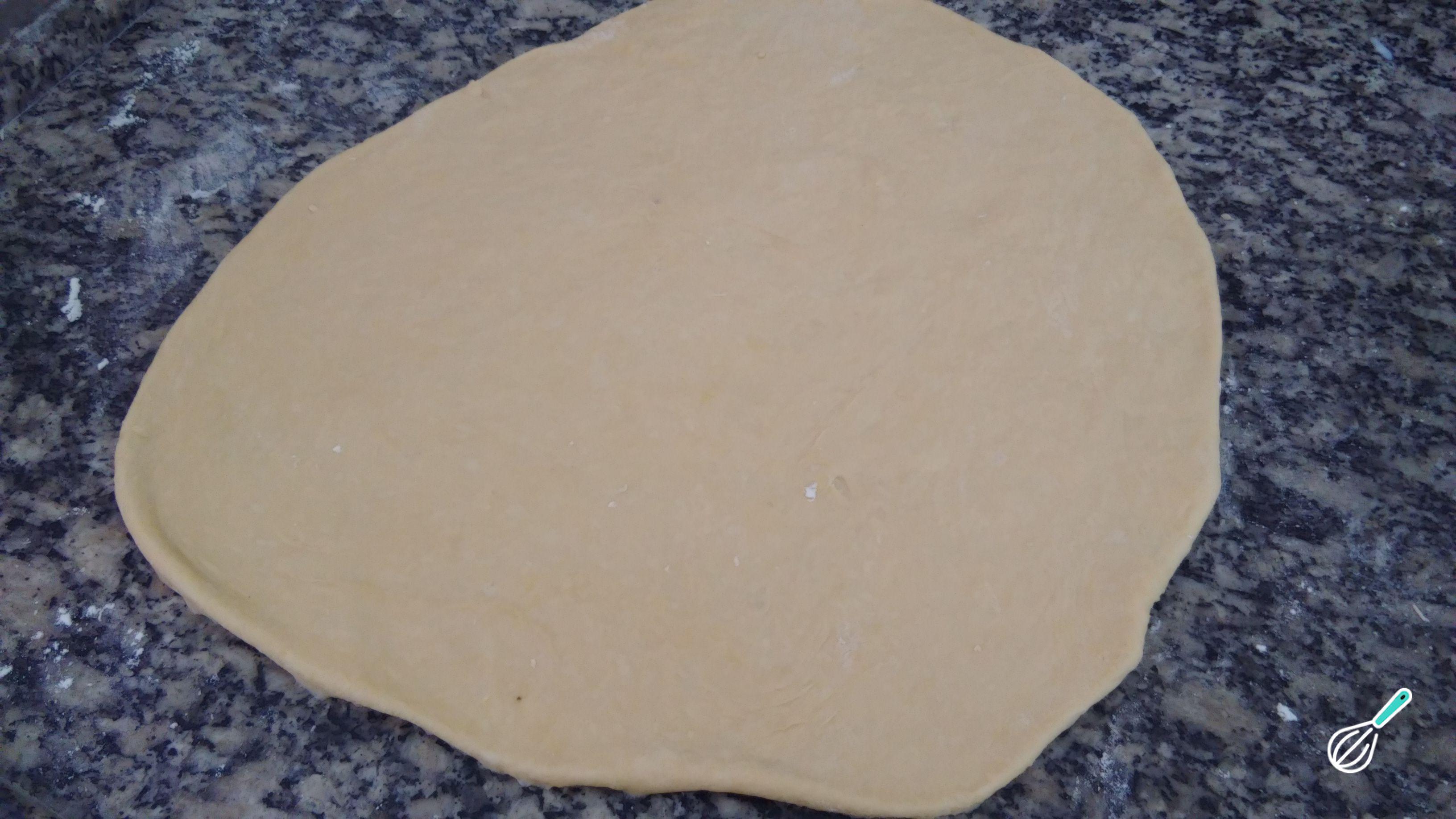 Após esse tempo, volte a enfarinhar a bancada e abra a massa com um rolo até que ela fique com cerca de 5 milímetros (mm) de espessura.