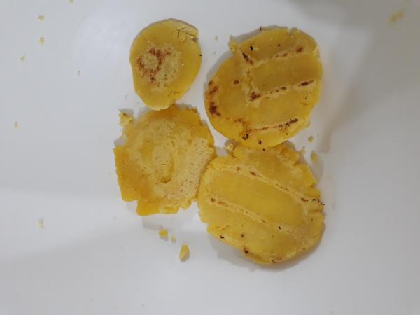 7- A arepa está pronta no momento que fica dourada por fora, con una faca podem ver se já está pronta.