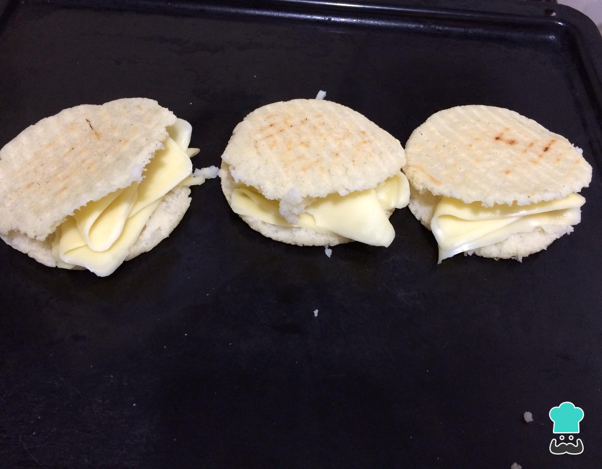 Quando estiverem prontas, sugerimos que abra as arepas, recheie com queijo em fatias e leve ao forno a 180ºC por 10 minutos. Desta forma as arepas terminam de cozinhar no interior e o queijo fica derretido.