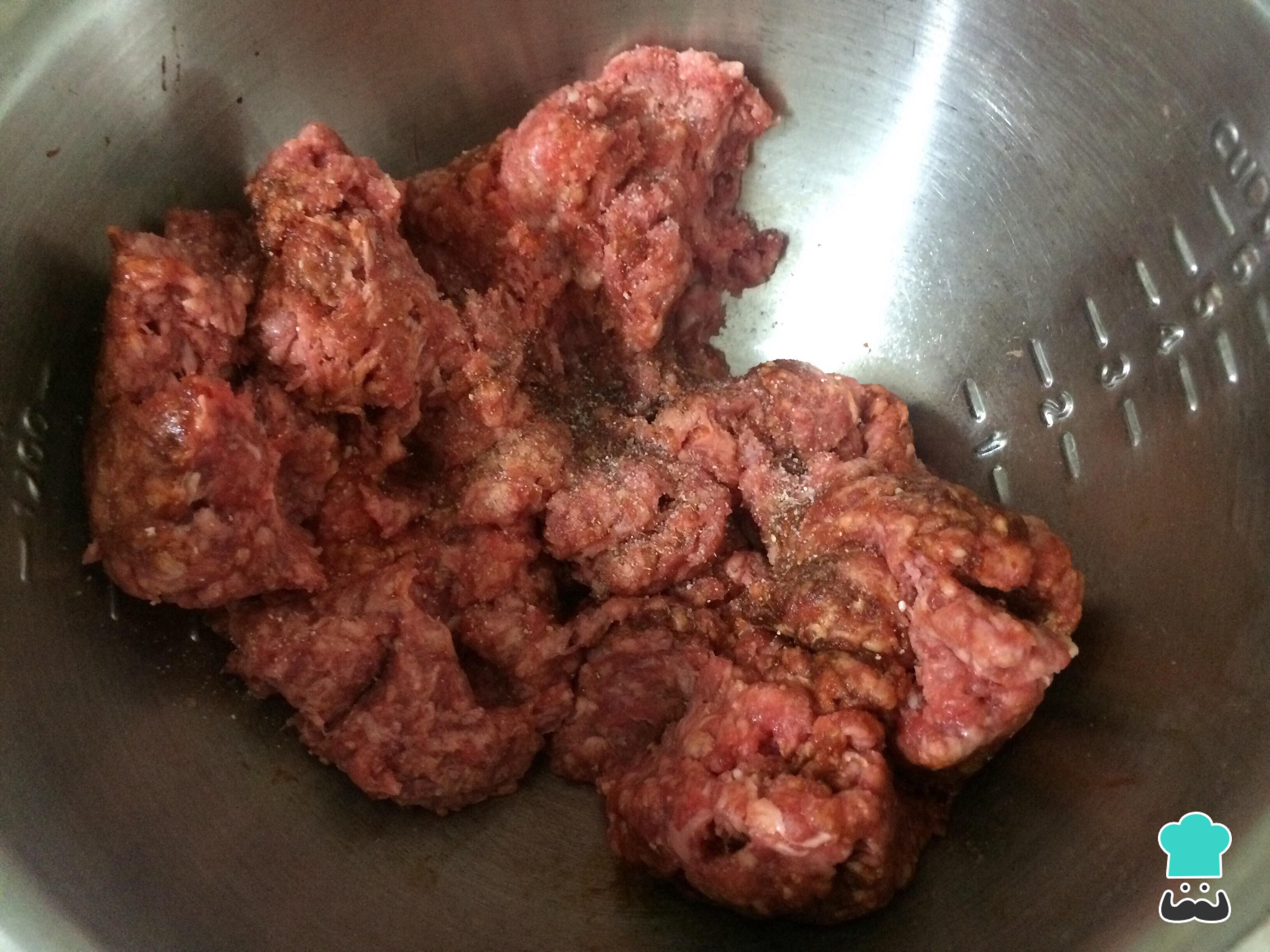 Ponha a carne moída em um recipiente e tempere com o molho de soja, o alho em pó, sal e pimenta do reino. Misture muito bem.