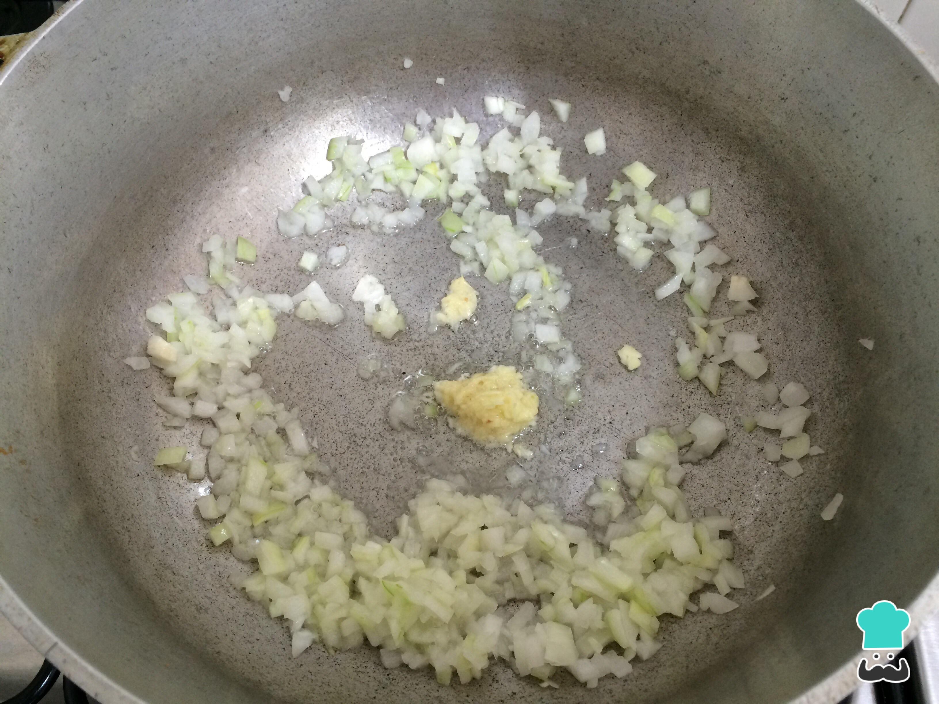 Numa panela com óleo, refogue a cebola picada finamente e o alho esmagado. Cozinhe até que a cebola fique mole. Tempere com sal e pimenta.