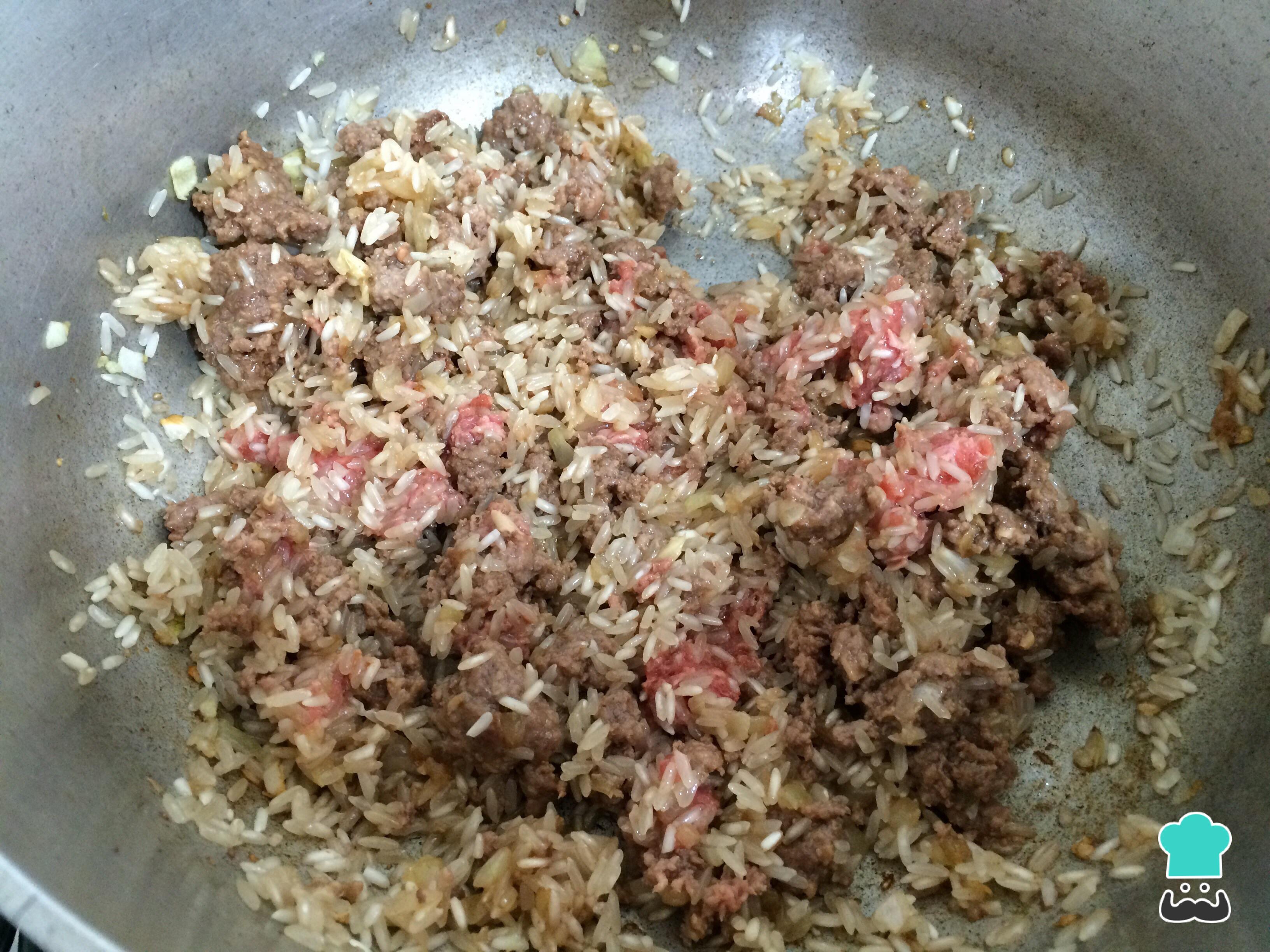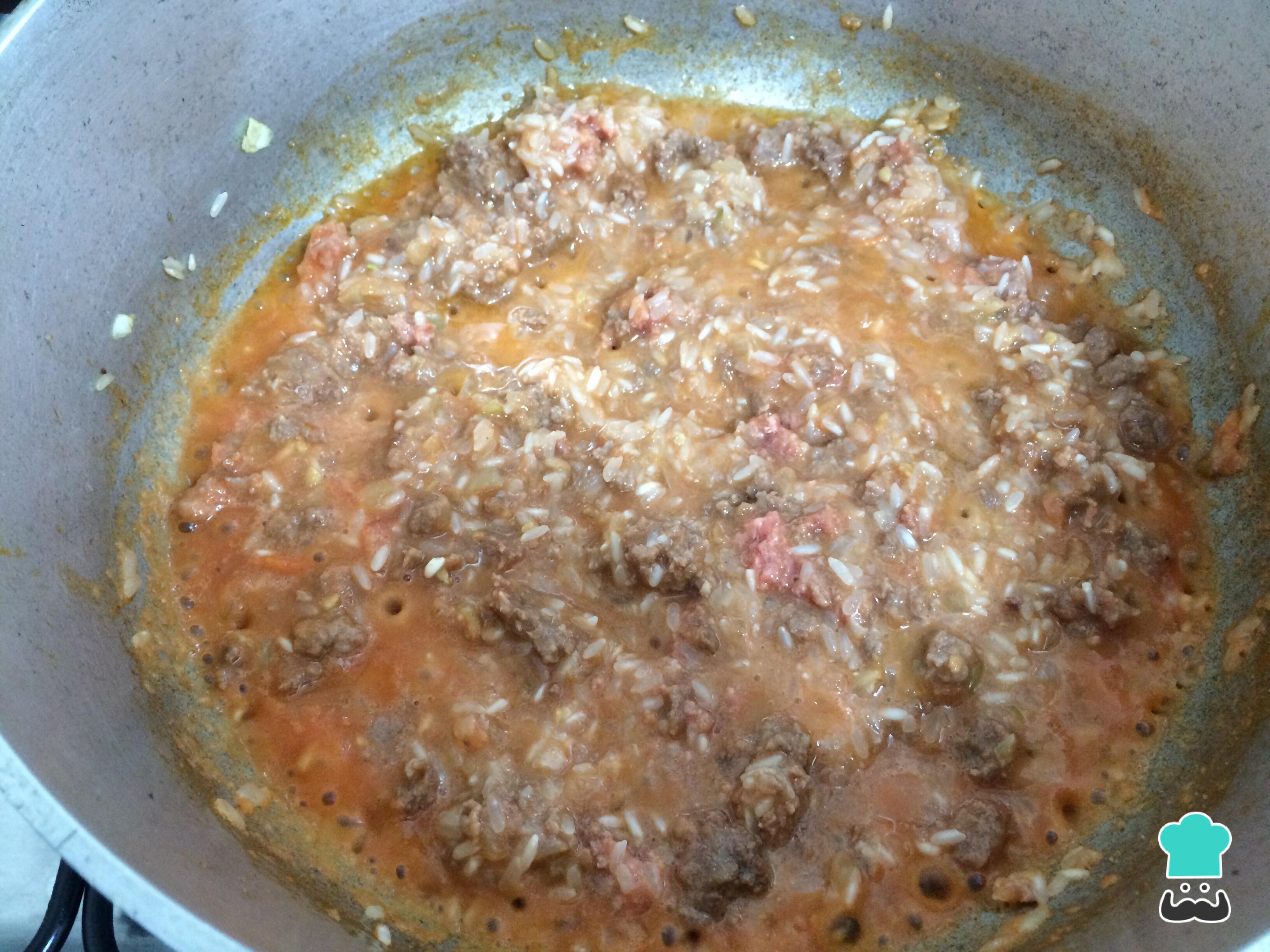 Adicione a carne moída e cozinhe em fogo alto durante 5 minutos. Passado esse tempo acrescente o arroz e misture tudo muito bem.